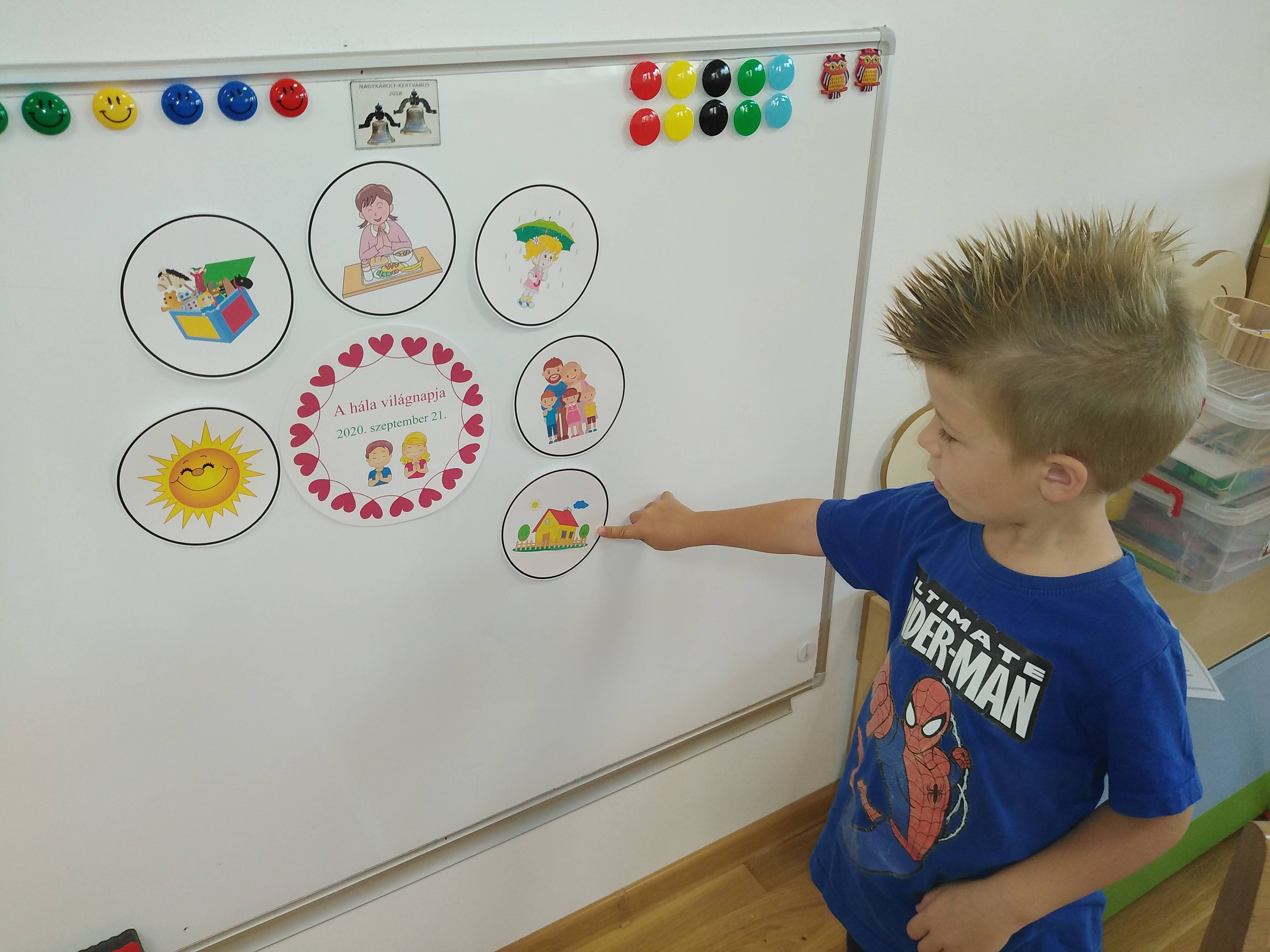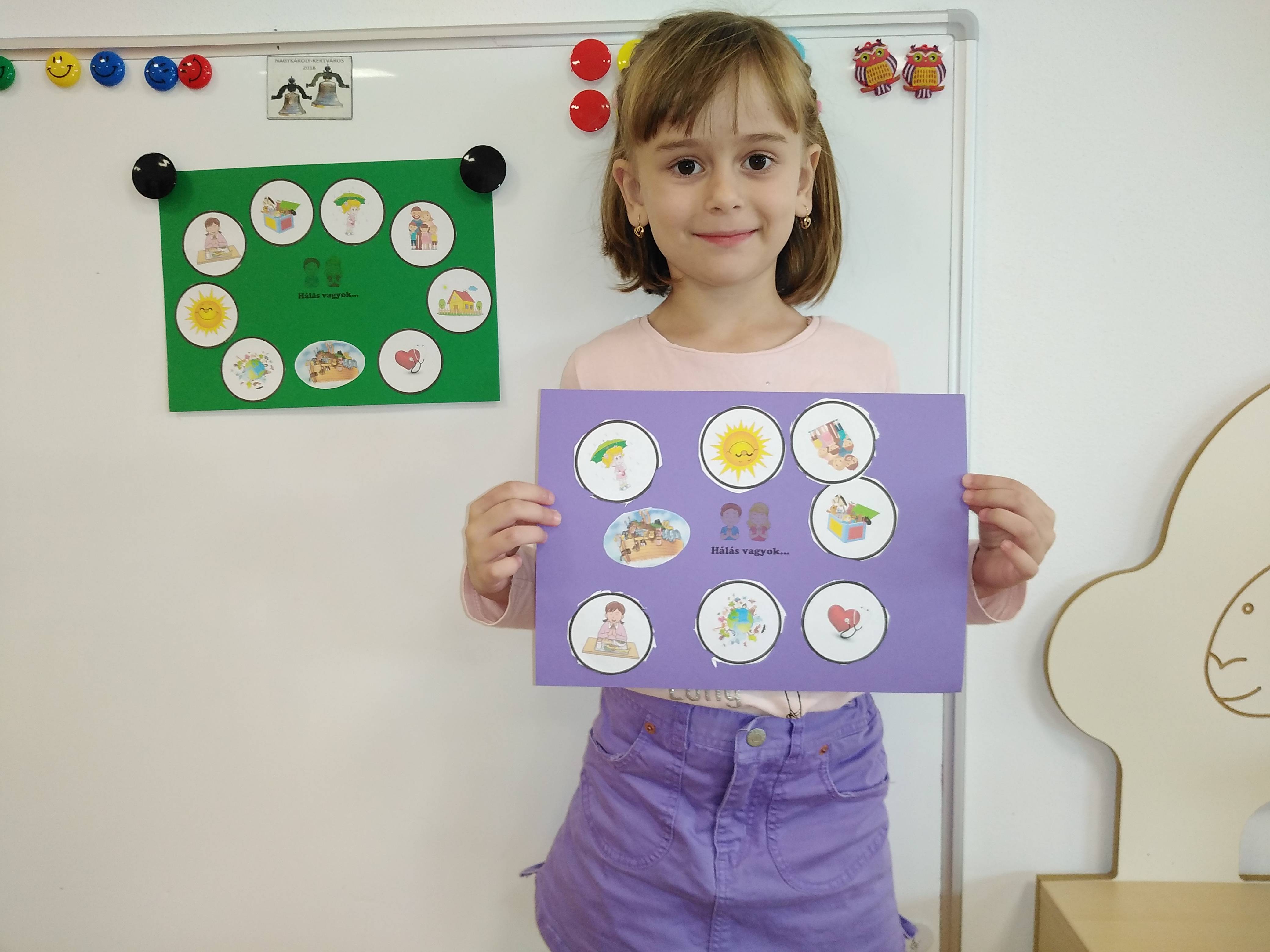 A hála világnapján, szeptember 21-én beszélgetni kezdtünk a gyerekekkel, hogy mi mindenért lehetünk hálásak, és hogyan fejezhetjük ki hálánkat. Felsoroltak néhány fontos dolgot, amiért hálával tartozunk, úgy mint: család, mindennapi étel, az eső, a napsütés, a játékok, a Földön élő összes állatért és növényért, az otthonunkért, de legfőképp az egészségünkért lehetünk hálásak ezekben az embert próbáló nehéz időkben. A gyerekek rájöttek, hogy minden óvodai napunkat hálaadó imádsággal szoktuk kezdeni: