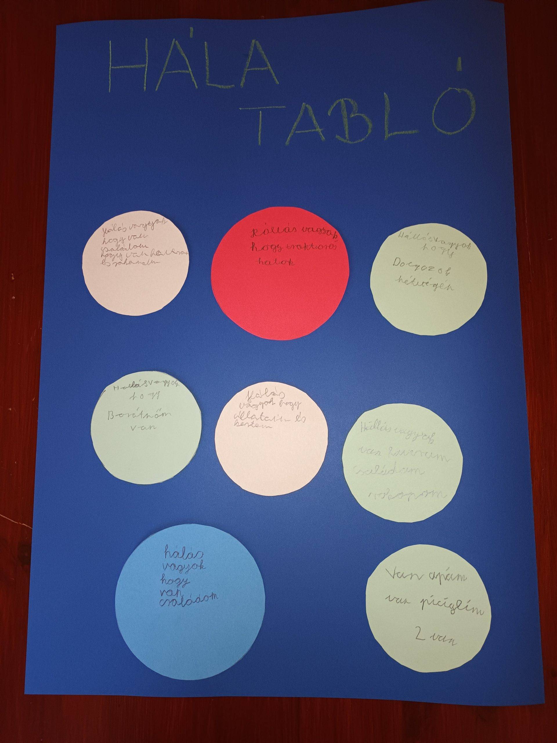 Az óra folytatásaként hála tablót készítettünk. Ez a tabló egész évben a tanulószobát díszíti, és ha a gyerekek úgy érzik, bővíthetik, gondolataikkal.