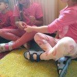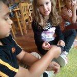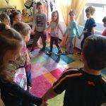 A foglalkozást Bagdi Bella dalával kezdtük. Körbeültünk, fogtuk egymás kezét és hallgattuk a dalt. A dal után megkérdeztem a gyerekektől, vajon miért lehetünk hálásak? Ezeket átbeszéltük, és megerősítettem bennük azt a sok jó ötletet, amit mondtak, s elmondtam én miért vagyok hálás nekik. Körbeadtunk egy színes levelet, amit utána mindenki, aki valakinek hálás valamiért továbbadta. Felhívtam figyelmüket az apró gesztusokra. Ezután elénekeltünk egy dalt, s mindenki egy párt választott, akivel „öröm táncot” járt. Ezután elmeséltem nekik a Hálafa történetét, amit át is beszéltünk.
