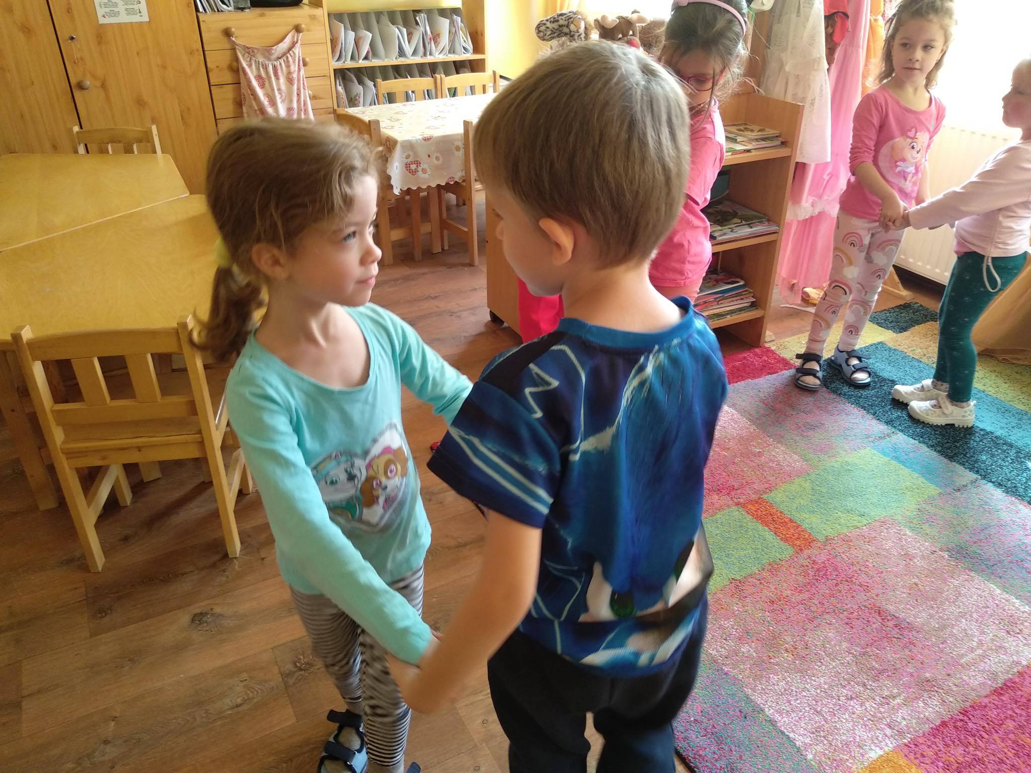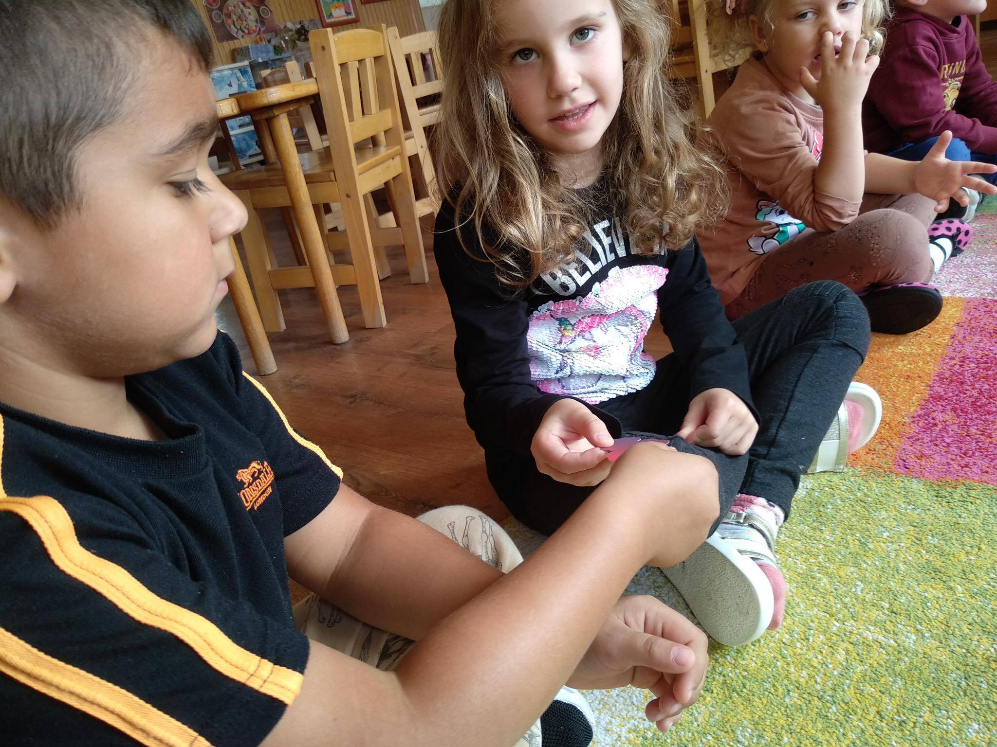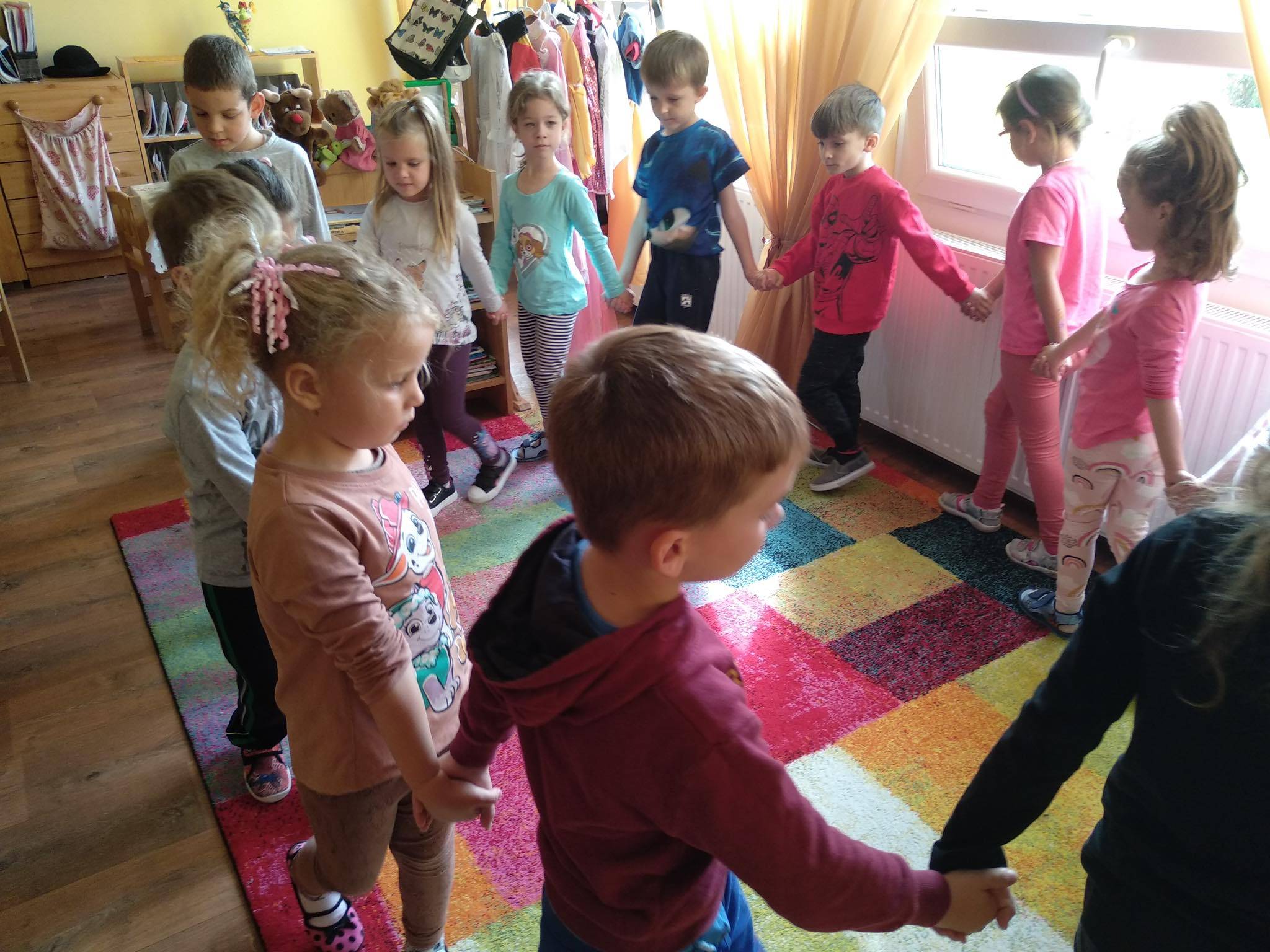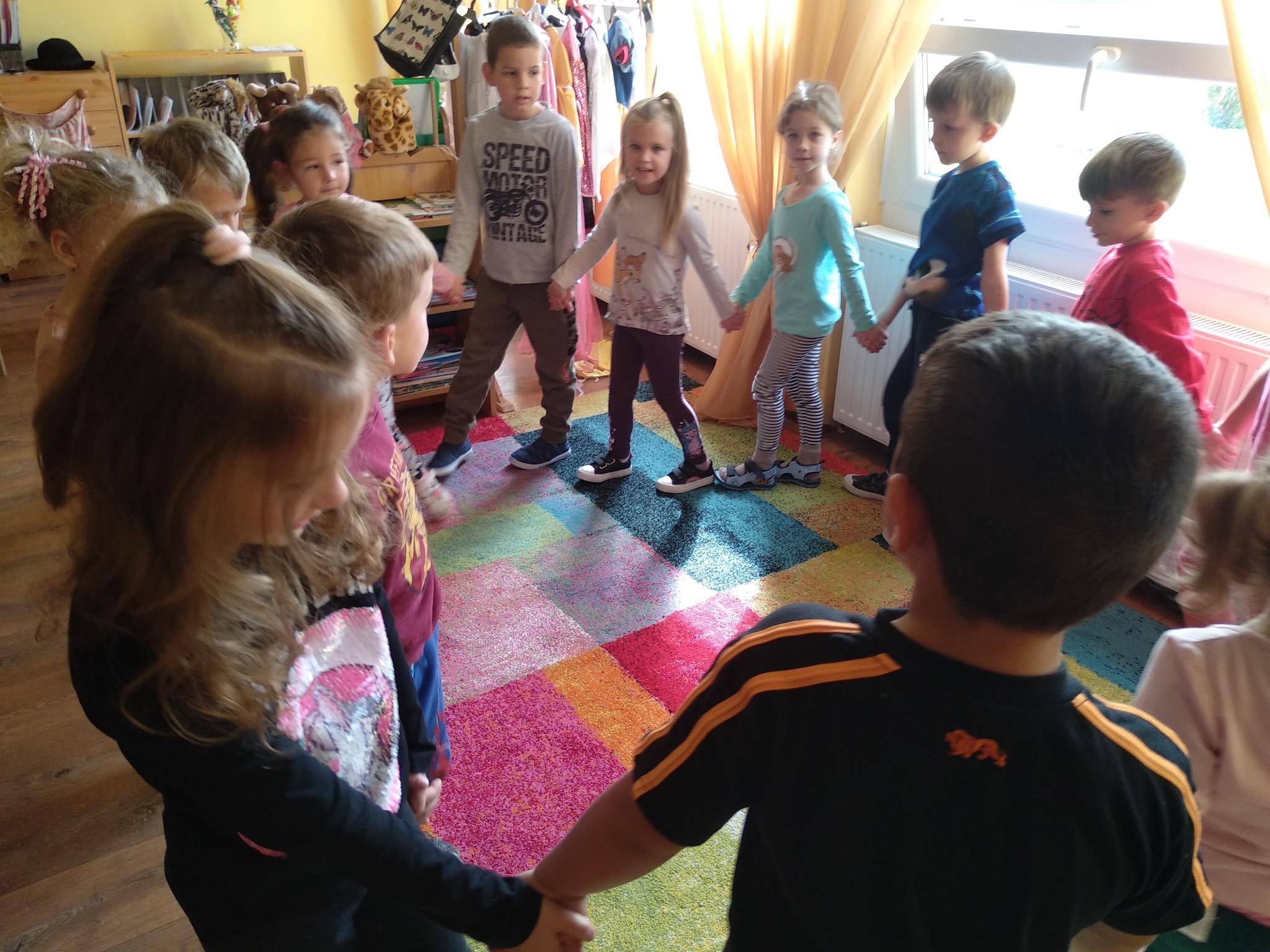 A foglalkozást Bagdi Bella dalával kezdtük. Körbeültünk, fogtuk egymás kezét és hallgattuk a dalt. A dal után megkérdeztem a gyerekektől, vajon miért lehetünk hálásak? Ezeket átbeszéltük, és megerősítettem bennük azt a sok jó ötletet, amit mondtak, s elmondtam én miért vagyok hálás nekik. Körbeadtunk egy színes levelet, amit utána mindenki, aki valakinek hálás valamiért továbbadta. Felhívtam figyelmüket az apró gesztusokra. Ezután elénekeltünk egy dalt, s mindenki egy párt választott, akivel „öröm táncot” járt. Ezután elmeséltem nekik a Hálafa történetét, amit át is beszéltünk.