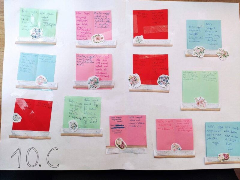 Ezekből a kis színes jegyzetlapokból, két A/3-as lapra ragasztva őket, elkészítettük a ‘hálaház’-unkat, ahol a feljegyzett lapok az ablakokat szimbolizálta. Minden ablak tulajdonosa kapott egy balkonládát, ahová bárki virágot „ajándékozhatott”.