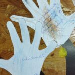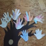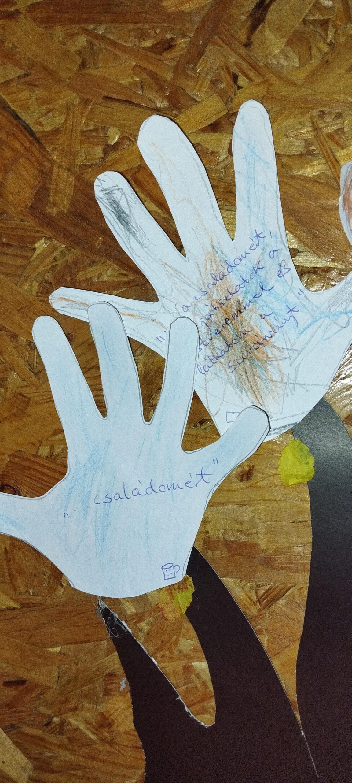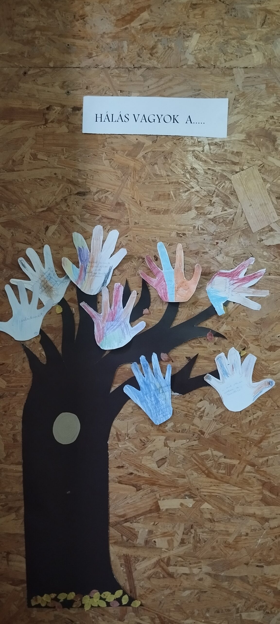 Ezután pihenésképp meghallgathatták a Hálás kisfecske történetét síkbábok segítségével. Majd hálafát készítettek olyan levelekkel, melyek a tenyerük átrajzolása, kiszínezése, kivágásával készült. Ennek közepébe beírtam, hogy miért hálásak, ily módon: Fejezd be a mondatot! Hálás vagyok…..