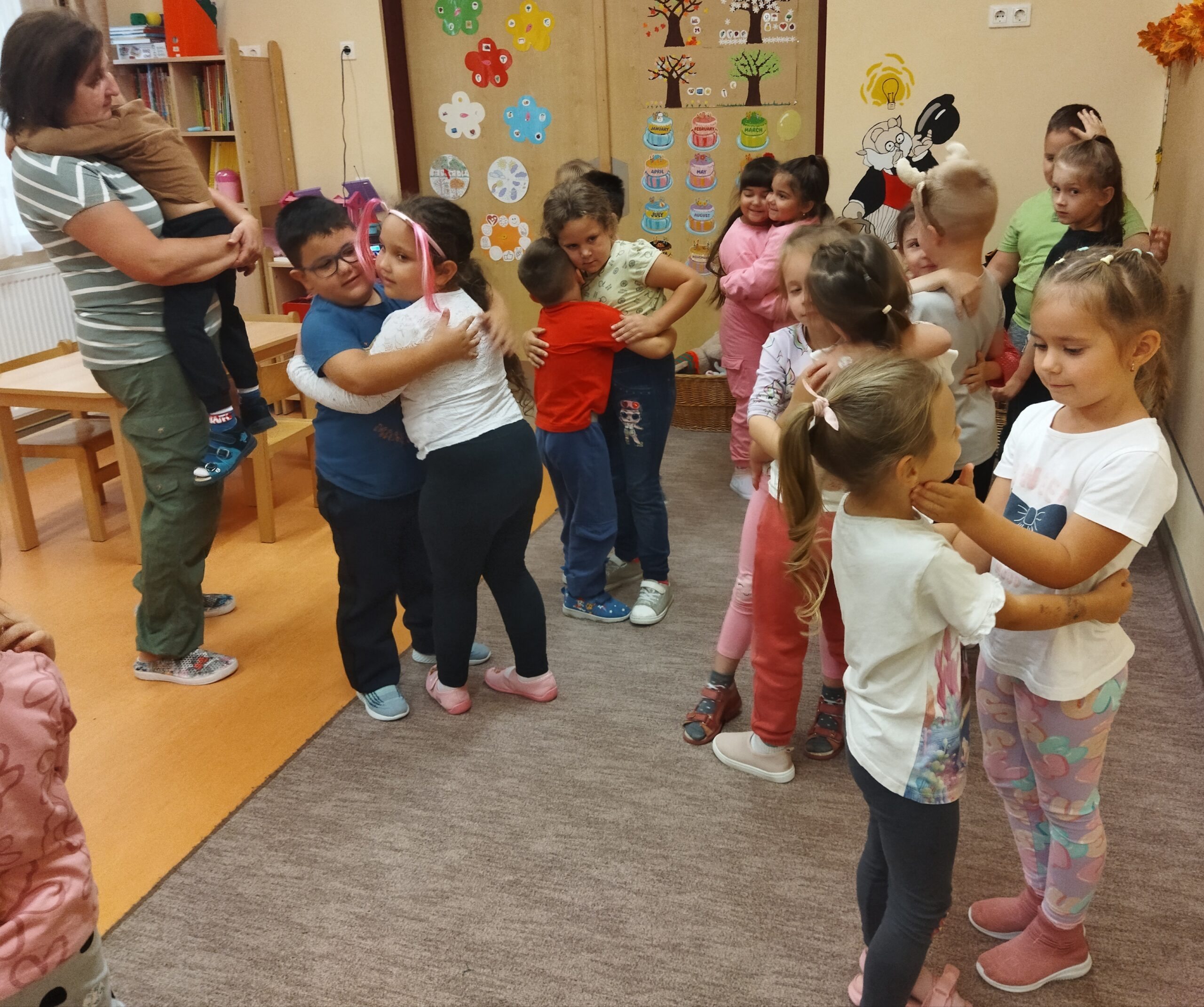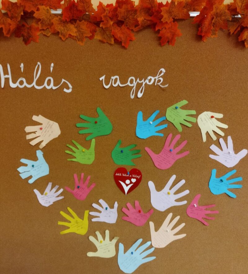 A héten a hálát gyakoroltuk a gyerekkel, ismerkedtünk magával a fogalommal, amihez segítségül Bagoly Benő plüss figurát hívtam. Ez a Benőke egy nagyon kíváncsi és csupa szív kis bagoly. Egyből meg is kedvelték a gyerekek. Megbeszéltük hogy a hála egyfajta köszönet fajta, amit pénzért nem lehet megvenni és oda adni. Ezt csak szeretettel tudjuk tenni és önzetlenül adni. De hálásak lehetünk valami vagy valaki iránt is. Itt igyekezett Benőke példákkal segíteni a gyerekeket: „Olyanért is lehetek hálás, mert szépen süt a napocska? Igen ezért is lehetsz, nagyon ügyes vagy.” Így már a gyerekek is könnyebben tudtak azonosulni a témával. Azért vagyok hálás, mert anya mesél nekem este. Azért vagyok hálás, mert apa meg anya szeret engem. Azért vagyok hálás, mert anya ad enni. Másnap Benőke megkérdezte a gyerekeket, nekik mi a kedvesség? Kézről- kézre szállt és úgy válaszoltak a gyerekek: Nekem az a kedvesség ha anya megdicsér, ha anya megsimogat, ha kapok mosolygós fejet óvónénitől. Ez után meghallgattuk Bartos Erika: Megsértődött a Gellért-hegy című mesét. Hát az igazat megvallva, ez a mese nem volt nekik való. Nem értették a mese lényegét, szerintem a rengeteg helyszín neve és nevezetesség miatt. Sok volt ezekkel kapcsolatban az információ, nem tudtak figyelni vagy is nem értették. Így kicsit eltérve az adott kérdésektől, magamtól próbáltam kérdezni a gyerekeket: Ki járt már Budapesten, ki látta már Gellért- hegyet, ki utazott már Siklóval. Kis sétált át már a Lánchídon? Meglepetésemre mindenki azt mondta, nem volt még Budapesten. Véleményem szerint sokan jártak már ott, csak ezeket nem látták. Megbeszéltük, hogy az év végi kiránduláson, akár ezeket a nevezetességeket is megnézhetjük. Tetszett a gyerekeknek ez az ötlet. Természetesen a témahét zenéje sem maradhatott el. Meghallgattuk először szépen ülve a szőnyegen, kicsit dülöngéltünk is a zene ritmusára. Majd felálltunk és párt választottak a gyerekek. Feladatuk az volt, hogy zenére meg kellett fogni a társuk kezét, megölelni, megszeretgetni, simogatni. Kedvesen mosolyogtak egymásra a gyerekek. Zene végén pedig megköszönték a táncot és puszit adtak egymásnak. Ez után hála rajzokat készítettek a gyerekek a legkedvesebb pajtásuknak, amiért a barátak és jókat játszanak együtt az oviban. Végezetük a hálafa elkészítése is megvalósult. A gyerekek kis kezét rajzoltuk színes lapokra, amit nekik kellett kivágniuk olló segítségével és ráírtuk miért hálásak. Majd szívecskét formálva a faliújságon kitűztük azokat.