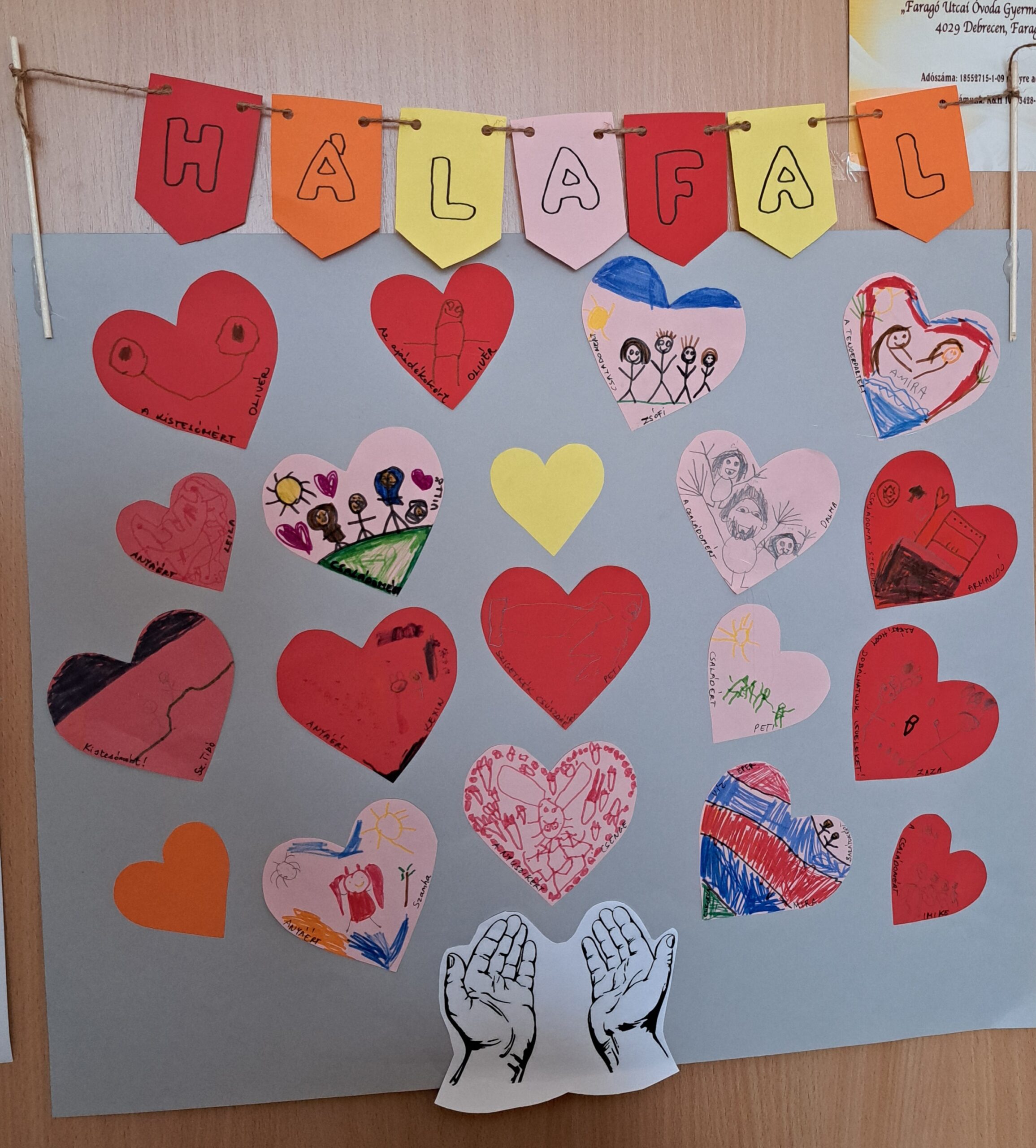 Októberben tovább folytattuk a Boldogságóra programot. A hála témakörében tevékenykedtünk. A beszélgetőkörünkben a” miért vagyok hálás ” témát boncolgattuk. Érdekes volt, hogy a nagycsoportosok számára is az ilyenfajta fogalmi gondolkodás nagyon feladta a leckét, el kellett vonatkoztaniuk. A gyerekek sokféle okot fel tudtak sorolni. Az élelmiszerekkel, a játékokon át egészen a családig, Anyáig. A végefele már alig tudtak megállni, sok-sok hálaok eszükbe jutott.