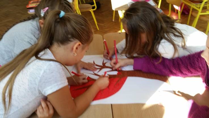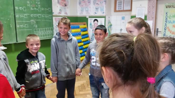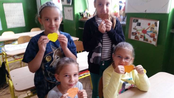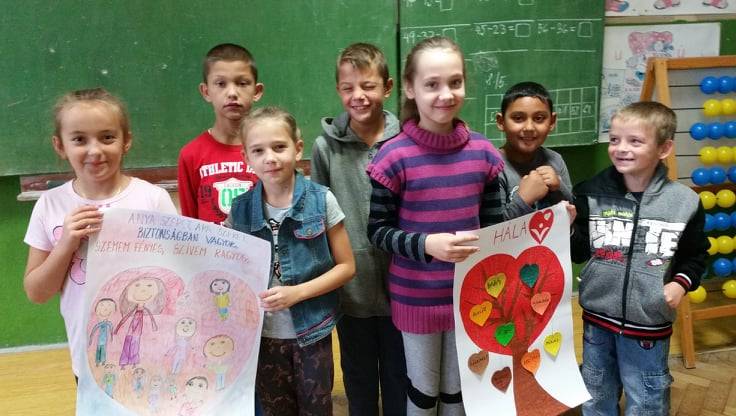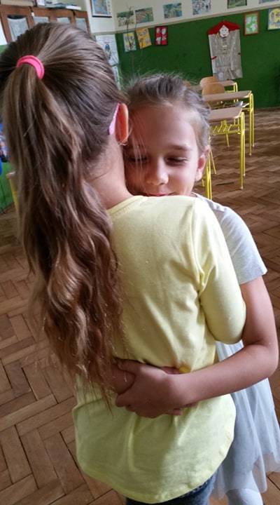 A boldogságórákat indító mozgásalapú relaxációs gyakorlatok közül a Fújj – fújj.. cíművel kezdtük el a foglakozást. A hónap dalának meghallgatása – a Szép nap ölelj most át engem … – , közös éneklése tánclépésekkel következett. A bevezetésben a hála kifejezési formáiról folyt a beszélgetés, a gyerekek által említett módok, köszönet, mosoly, jó cselekedet , segítség, ölelés, bátorítás, stb. A hála gyakorlását hálafa készítésével folytattuk. A téma feldolgozásaként hálalevél megírása volt a diákok feladata. Néhány soros kis levelek készültek, amelyek leginkább a szülőknek , barátoknak szóltak. A Lapozgatóban ismert emberek hálával kapcsolatos gondolataival ismerkedtek a résztvevők. Szeretet kupont töltöttek ki , amelyeket el kellett rejteni és a megtalálás után be lehetett váltani kis kedvességekre. A téma lezárásaként osztálytársaik felé is kifejezték hálájukat , a lányok öleléssel, a fiúk kézfogással . Meditációval zártuk a foglalkozást. A meditáció : ,,… anya szeret, apa szeret, biztonságban vagyok, szemem fényes, szívem ragyog, hálát adok, hálát adok, köszönetet adok, kapok, hálás vagyok, hálás vagyok … A kis Kópék megrajzolták a meditáció alkalmával kiket zártak a szívükbe, kiknek hálásak. 🙂