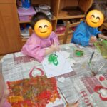 Fújja a szél a fákat… c. mondóka (közben ritmustapsolás) többszöri ismétlése, majd eljátszása a gyerekeknek. Megbeszéltük, hogy mindannyian kis fák vagyunk, akiknek ágait a viharos őszi szél jobbra-balra hajlítgatja.