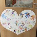 Kivágtunk egy nagy szívet kartonból és mindenkinek körbe rajzoltam a kezét, azt pedig kiszínezték a gyerekek. A végén beleírtam a gondolatot, amiért hálát érez az adott kisgyermek.