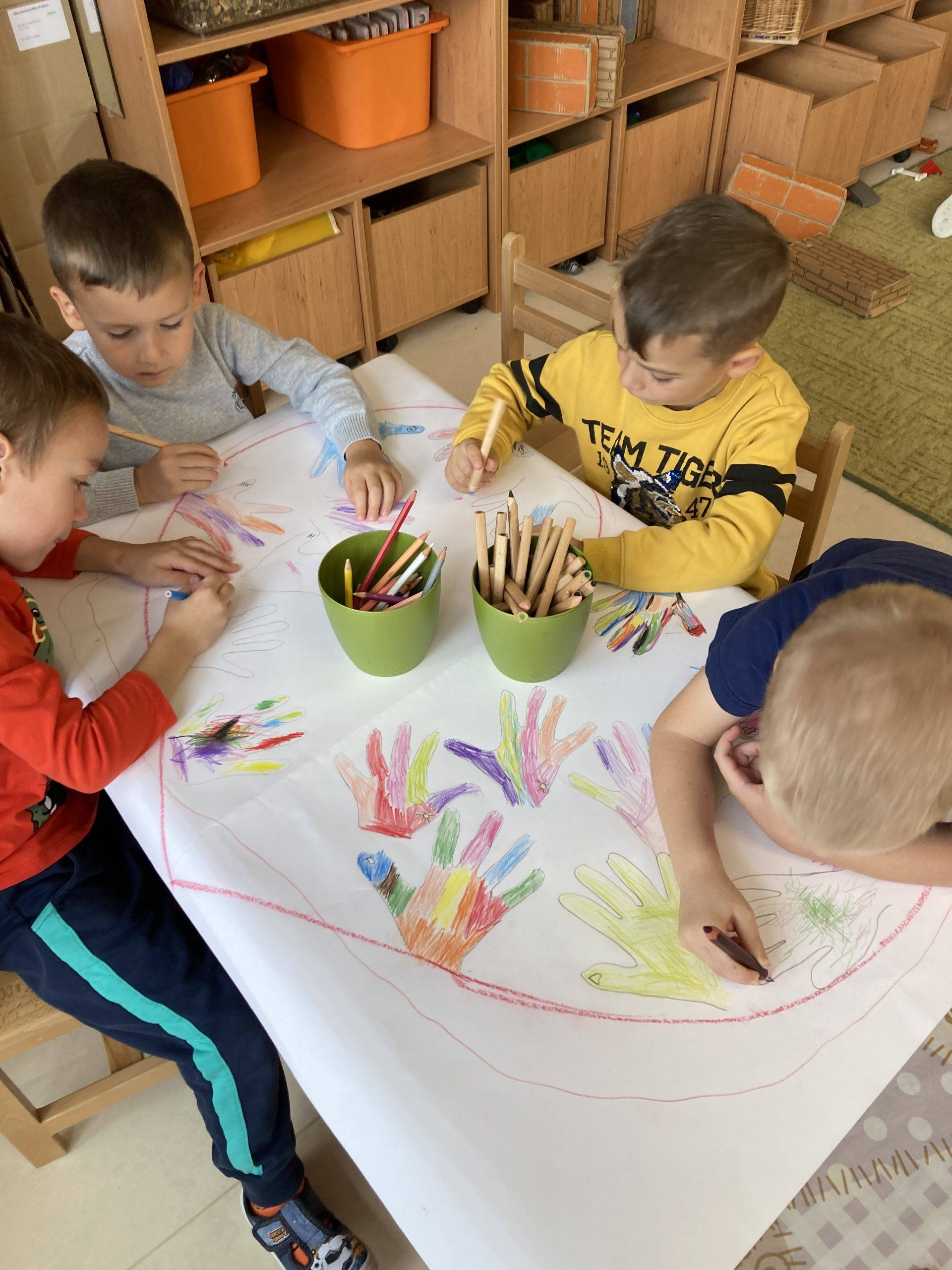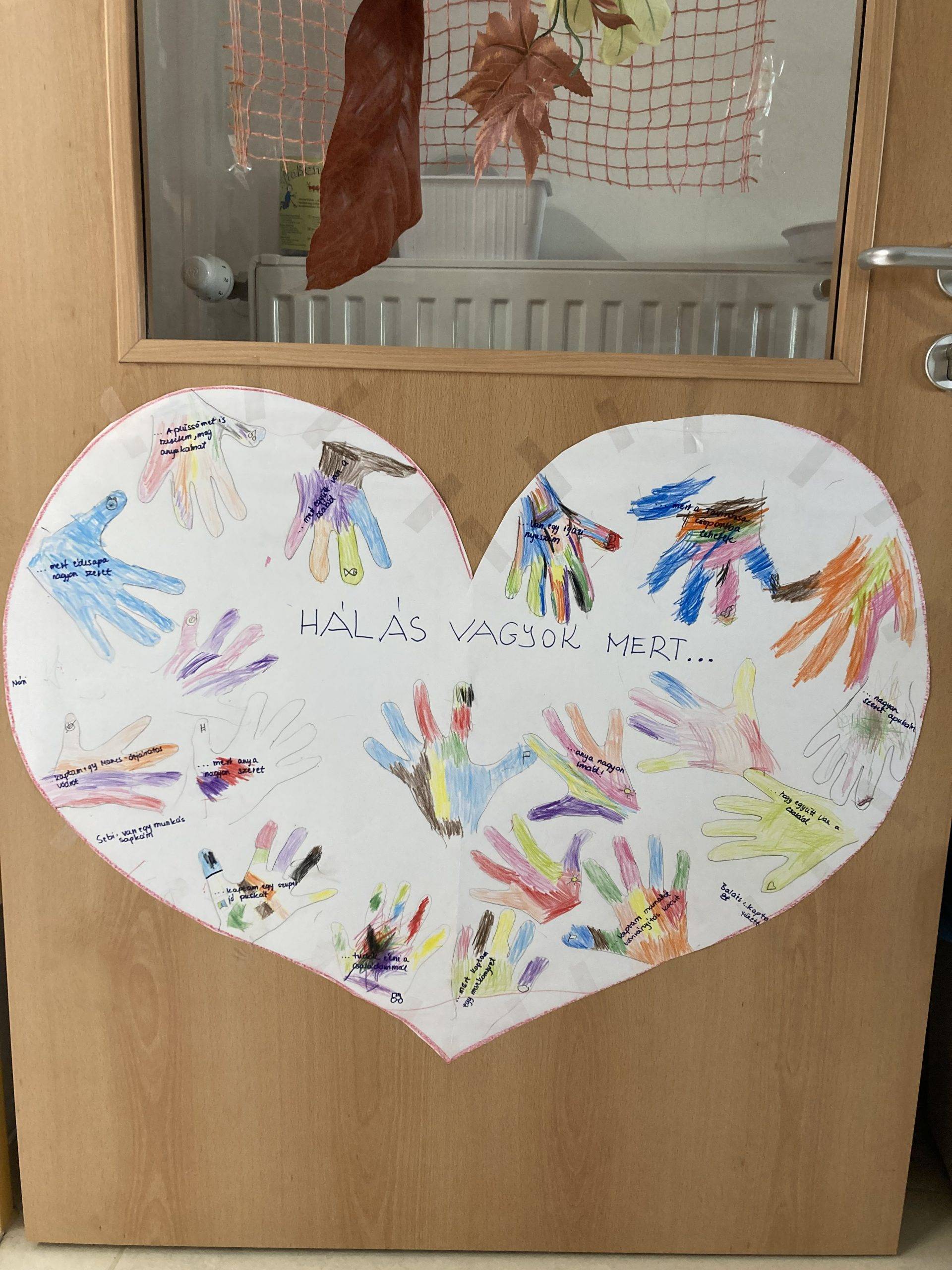 Kivágtunk egy nagy szívet kartonból és mindenkinek körbe rajzoltam a kezét, azt pedig kiszínezték a gyerekek. A végén beleírtam a gondolatot, amiért hálát érez az adott kisgyermek.