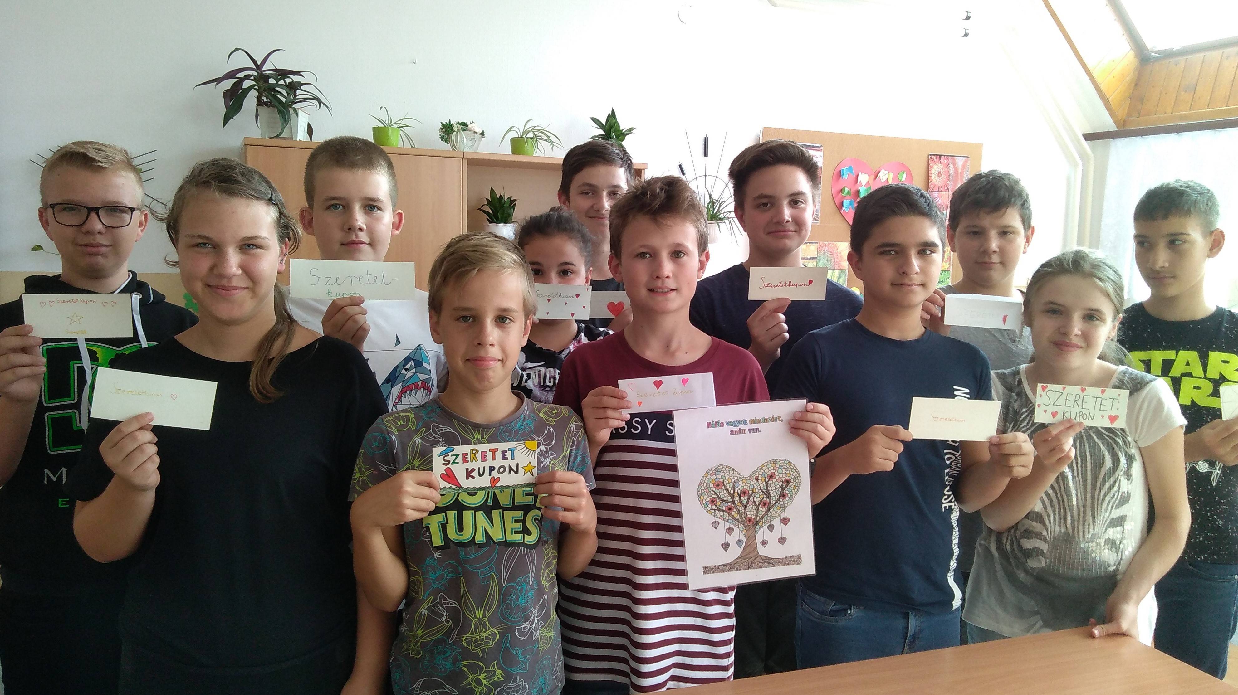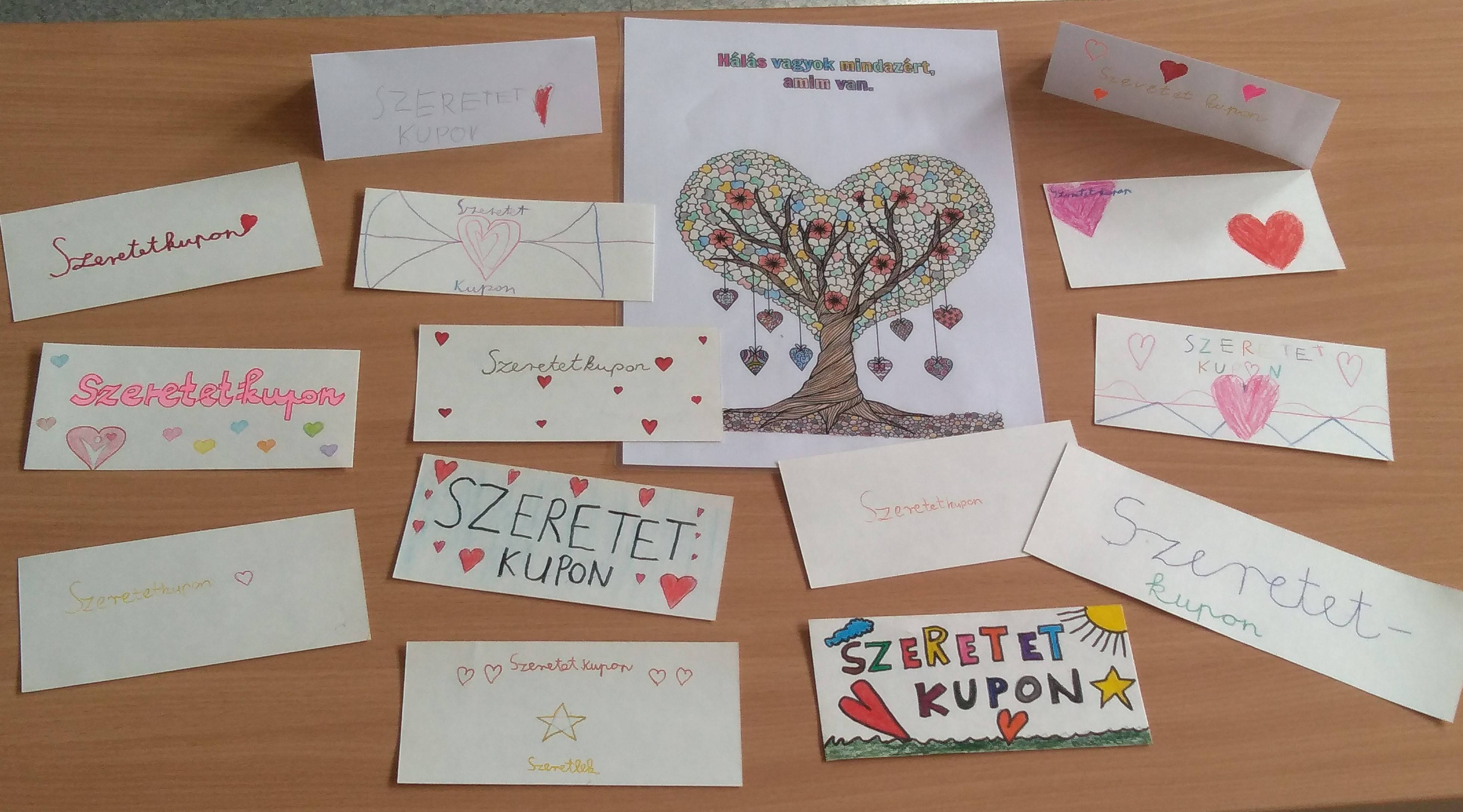Az első osztályfőnöki órán megbeszéltük a gyerekekkel, hogy ebben a tanévben is bekapcsolódunk a Boldogságóra Programba. Szeptember elején már igyekeztünk ráhangolódni az első témára. Azt kértem a tanulóktól, hogy esténként gondolják végig, mi minden történt velük aznap, és jegyezzék fel, kinek és miért lehetnek hálásak, kinek és miért tartozhatnak köszönettel. A téma feldolgozására a következő osztályfőnöki órán került sor. Beszélgettünk arról kinek mit jelent az öröm, a boldogság, illetve a hála fogalma, és megbeszéltük azt is, hogy milyen módon tudjuk a hálánkat kifejezni. Végül a gyerekek szeretetkupont készítettek, melyben felajánlottak egy olyan szeretetből jövő tettet, mellyel örömöt okoznak, mellyel kifejezhették hálájukat.