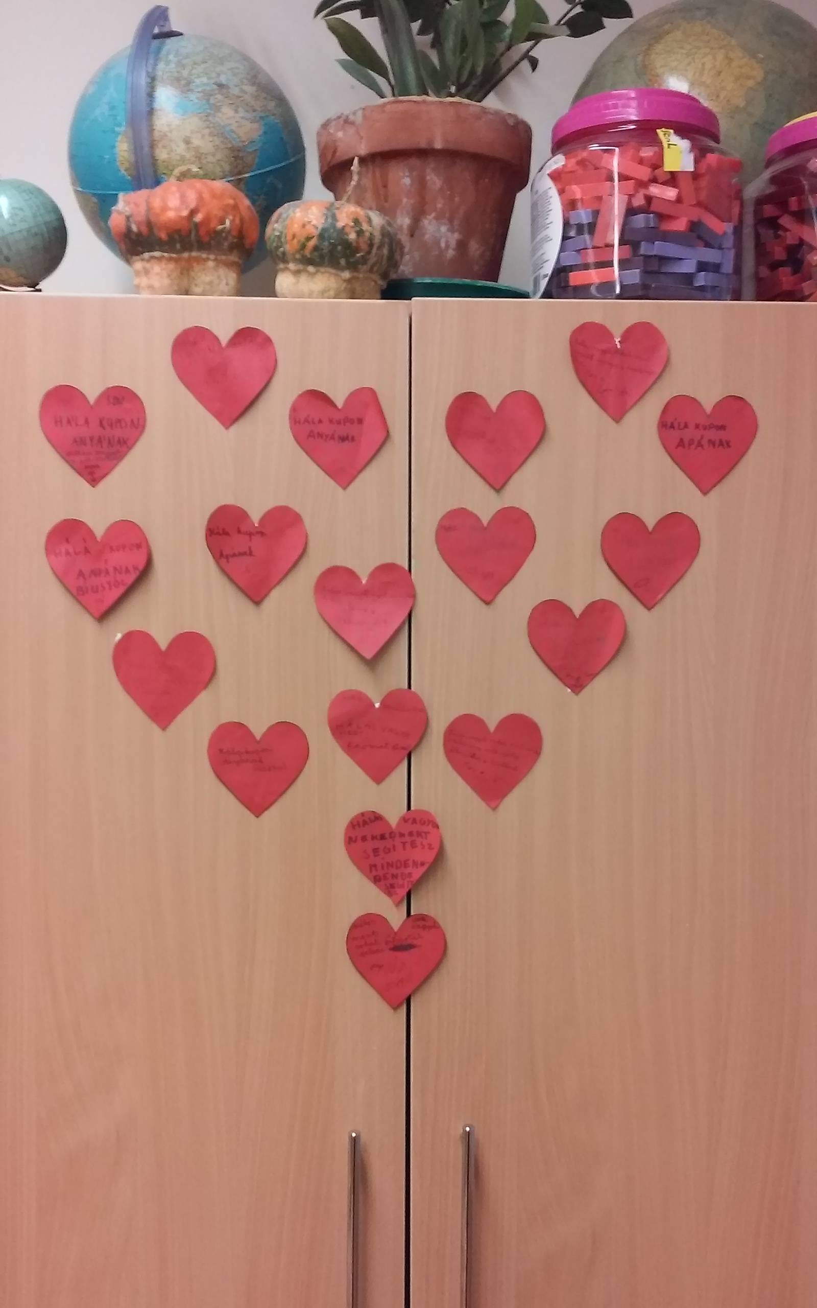 A gyerekek „hálakuponokat” készítettek, melyeket általuk kiválasztott személyeknek adták át. A kuponokat visszakapták,miután a kiválasztott személy egy kérésének eleget tettek. A kuponokat az osztályteremben a szekrényen szív alakban gyűjtöttük.