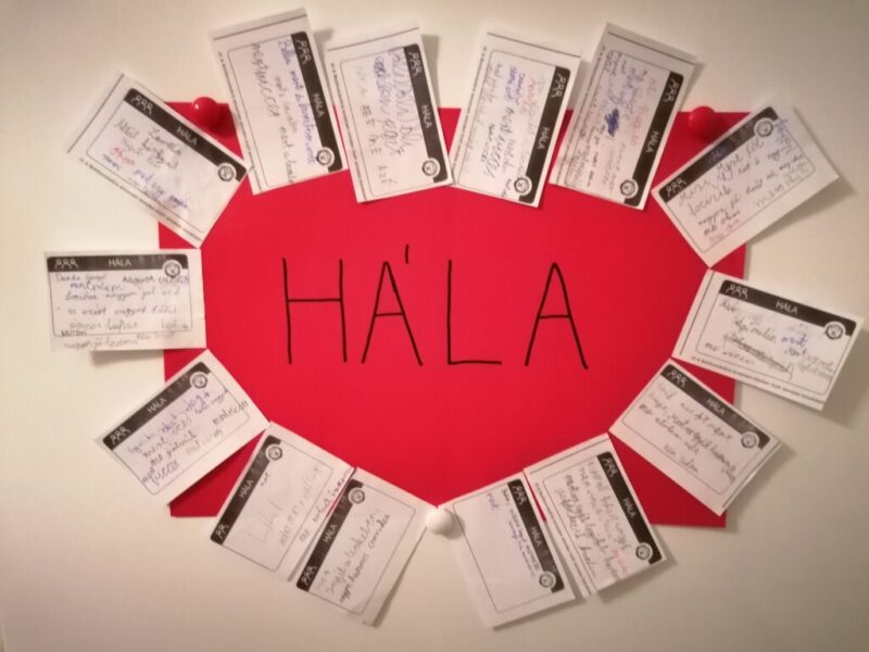 Az ötödikesekkel második éve foglalkozunk a boldogsággal. A hála immár ismerős volt számukra. Relaxáció után átismételtük a tíz témát. A hálával kapcsolatban elmondták miért, és kinek hálásak. Használtuk a kérdés kártyákat. Párban megbeszélték a válaszaikat. Az üres kártyalapokra egymásnak írtak hála üzeneteket, amit kitettünk az osztályba. Meditációval fejeztük be az órát.