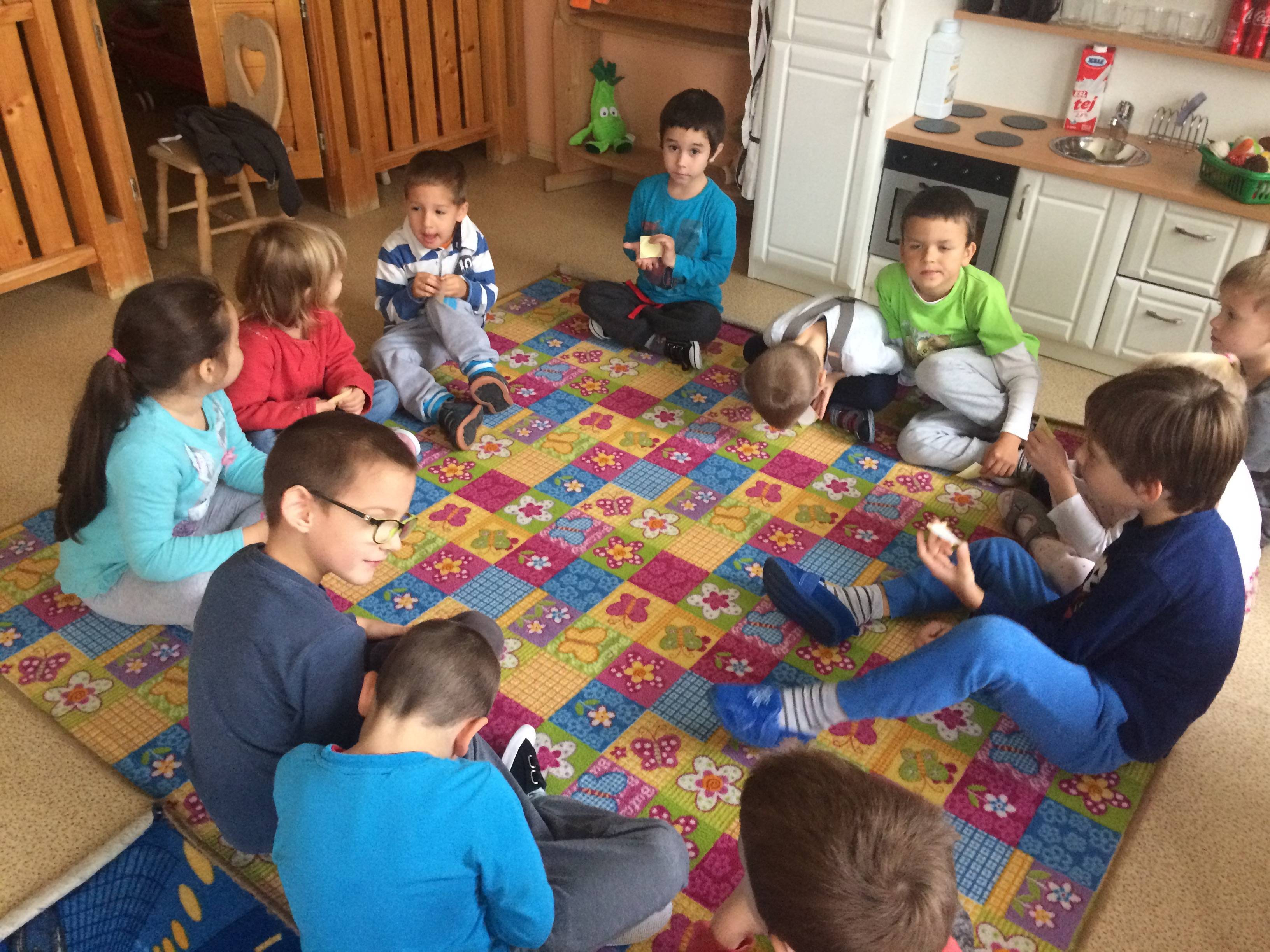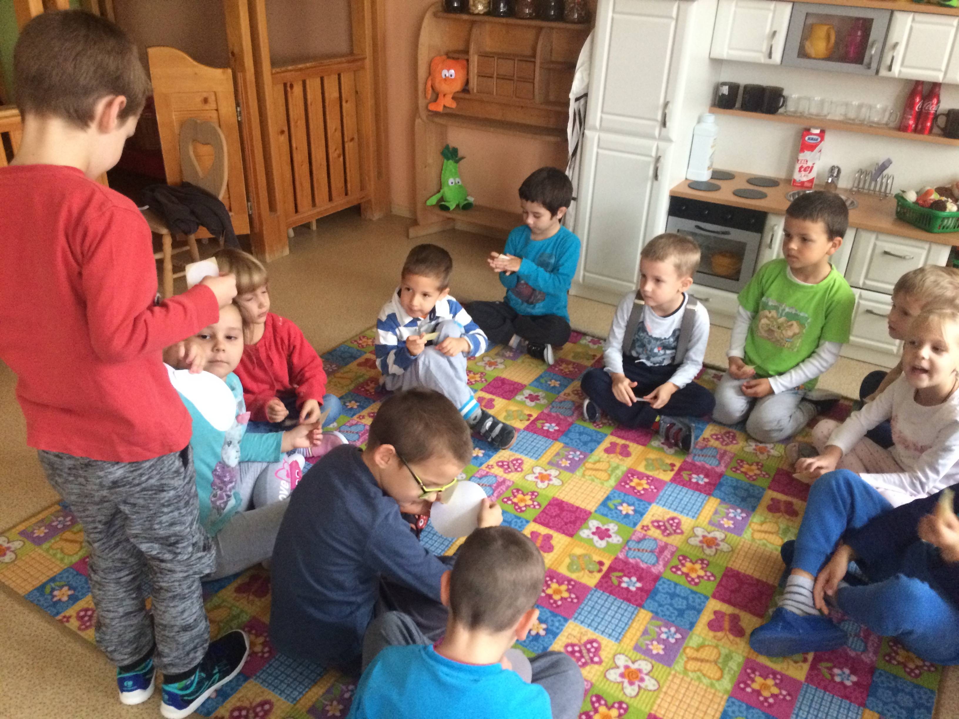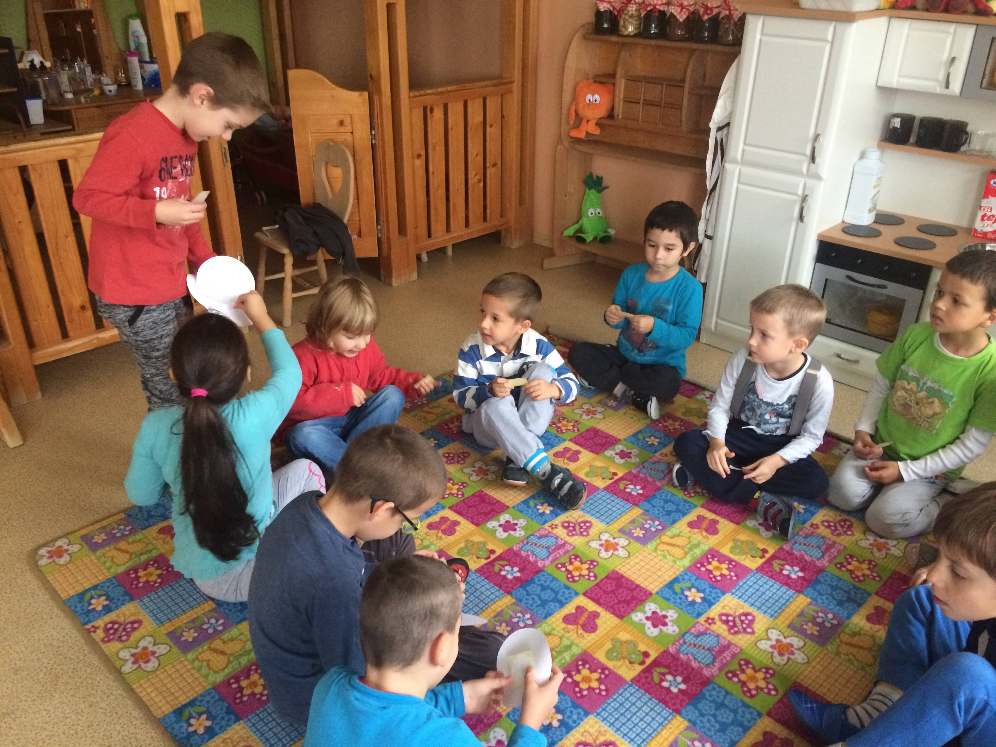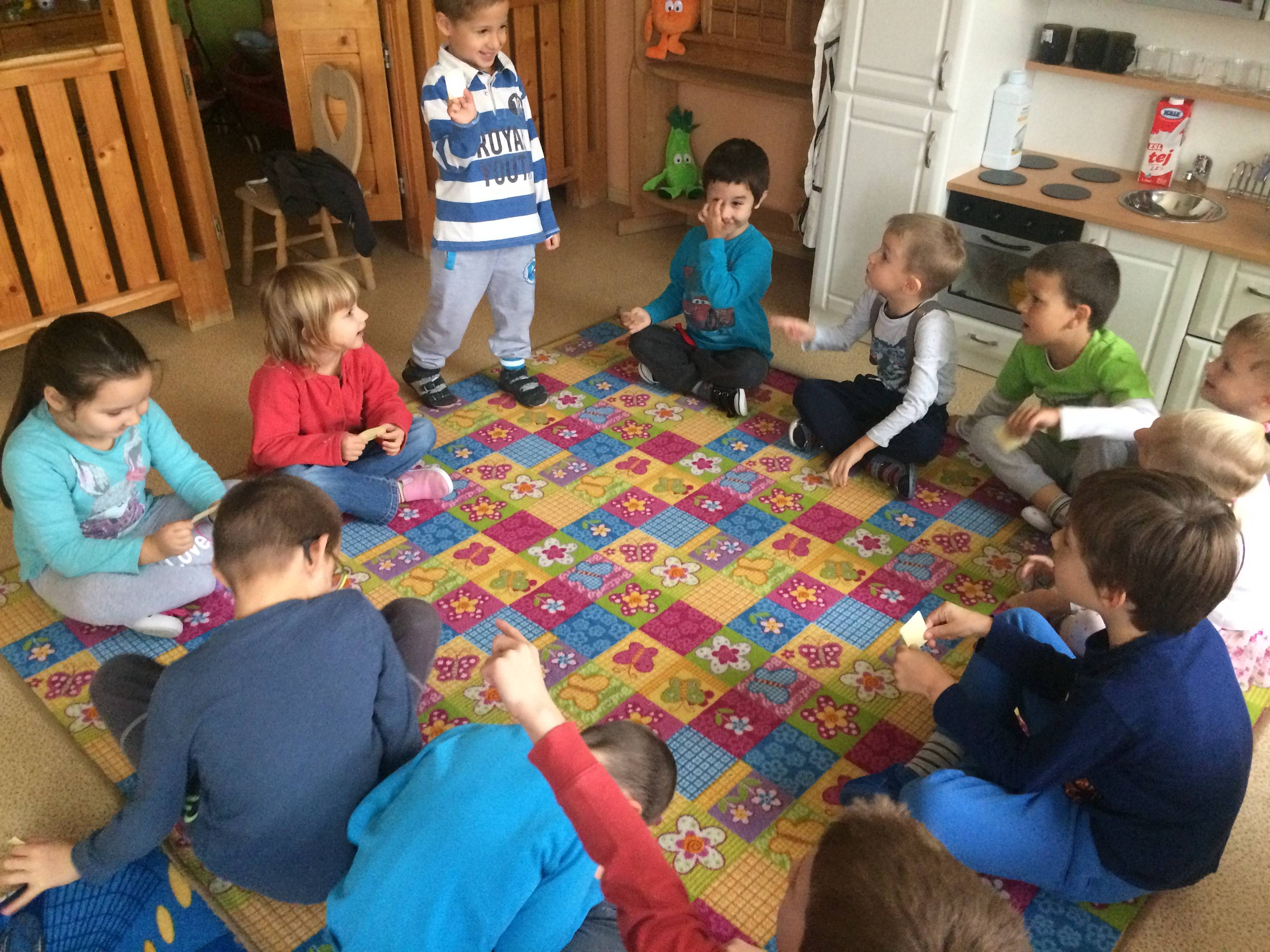 A hála témáját a csoportunkban egy hétfői napon, délelőtt dolgoztuk fel. A hét eleji szokás beszélgető körünkből kiindulva beszélgettünk róla. Egy kis játék előzte meg, ami egymásra figyelést kívánt meg. Filcből készült faleveleket kellett tovább adni egymásnak, úgy hogy ne érjenek össze. Egymást bíztatták, és figyeltek hogy hol tartanak a levelek. Az, hogy mit is jelent a hála, nem igazán tudta senki megmondani, de miután elmagyaráztam nekik, mindenki elmondta egymás után, kinek vagy minek és miért hálás. Több mint a fél csoport a társának köszönte meg azt, hogy a barátja és játszik vele. Volt aki az anyukájának, volt aki azért, mert aznap ebéd után jött érte az anyukája, vagy mert a csoport legnépszerűbb játékával játszhat. Készítettünk közösen egy hála-táblát, amire a gyerekek rajzolhattak pöttyöt annak a társuknak, akinek valamit megköszönnek. Ezt a nap folyamán tovább bővíthették.
