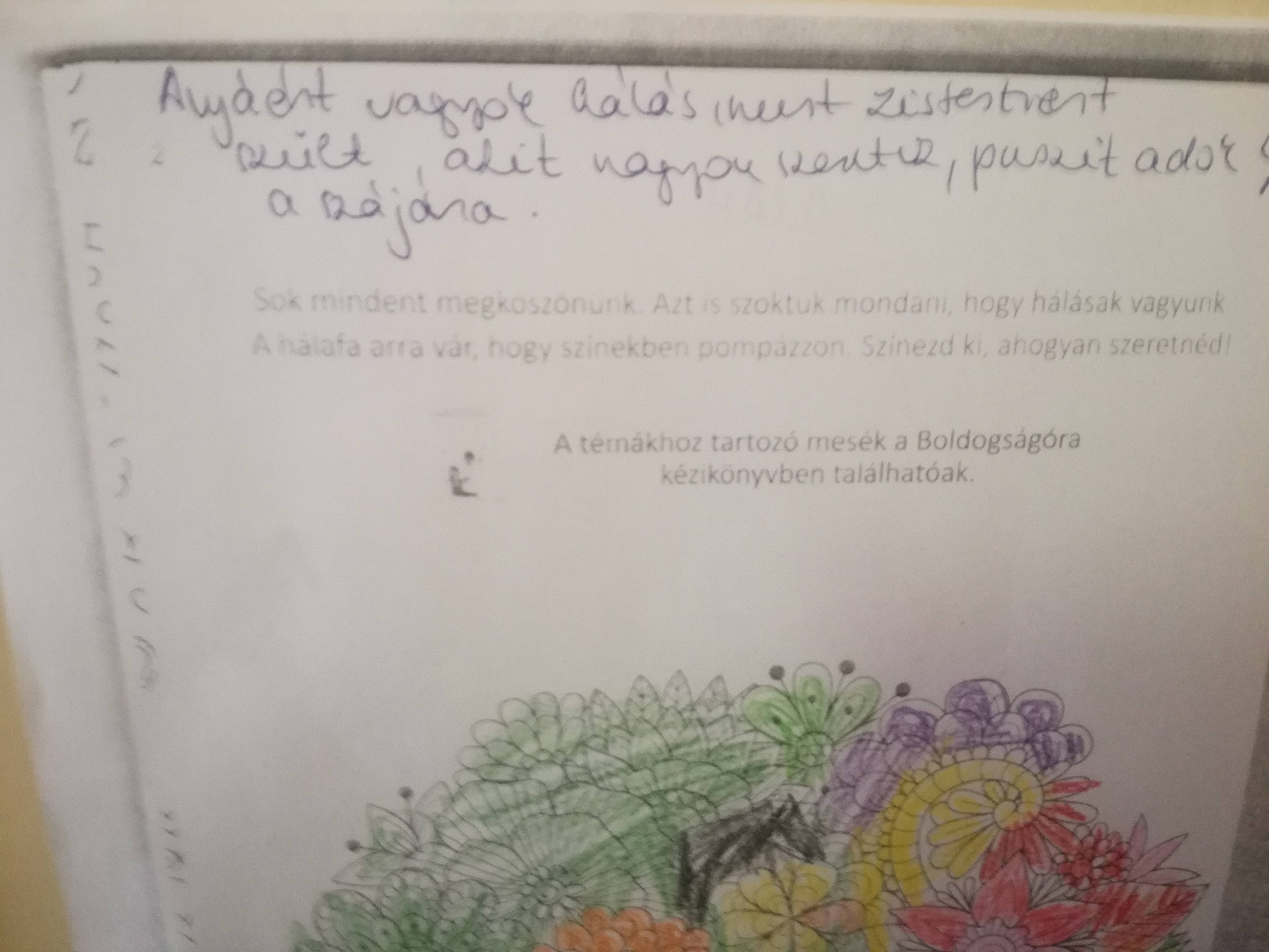 Elsősorban hálás vagyok, mint az intézmény vezetője a kedves nyugdíjas kollégámnak, hogy belemert vágni a Boldog óvodai programba.Ez a program számára is terápiaként működik,mert megözvegyült, így a tátongó űrt a gyerekek szeretete próbálja kitölteni. Ő lepődött meg a legjobban, hogy a program működik, a gyerekek rendkívüli módon élvezik, ezért minden héten egy napot arra szánunk, hogy a csak Boldog foglalkozást tartsunk. A gyerekek megosszák gondolataikat, a maguk egyszerű ,szűk szókincsükkel, de arcuk több mindent elárul.Az óvodai csoportban egy főfalunkon, pont a bejáratnál,gyarapodnak a Boldog alkotások és a szülők számára is leolvasható, hol tartanak a gyerekek a programban.
