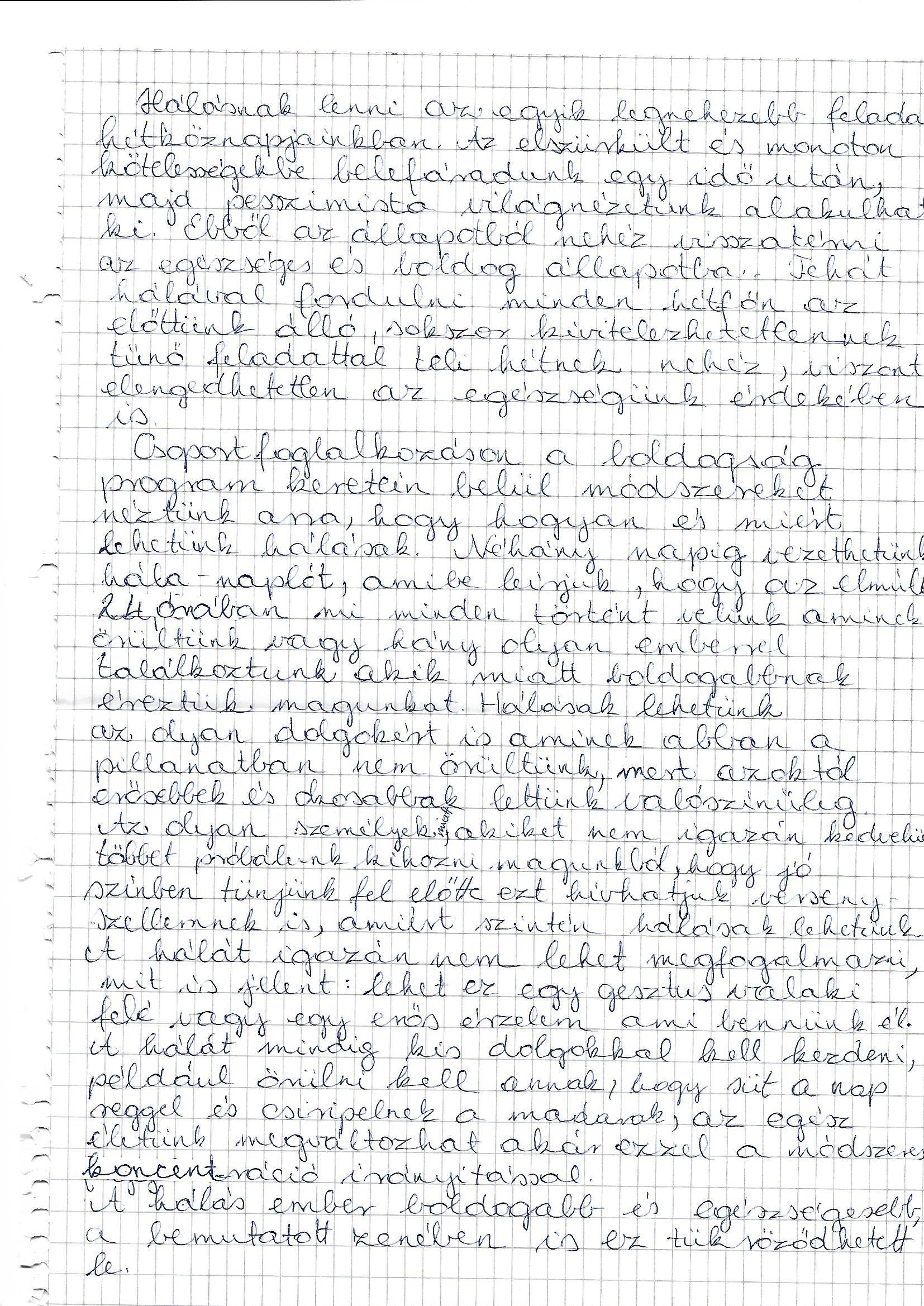 Kollégiumi foglalkozás révén átbeszéltük inkább ezt a témakört, megnéztük az ide kapcsolódó youtube videókat, valamint egy kis feladatot kaptak, minden nap legalább egy hétig hálanaplót kellett vezetniük. Fontosnak tartottam kiemelni, hogy ebbe bárki, bármit írhat, hisz nem lehet tudni, hogy épp ki és miért lesz hálás. A naplókat elolvasva igen sokszínű munkák születtek. Volt aki a legújabb telefonjáért, cipőjéért, Glamour napért volt hálás, de akadtak olyanok is, akik sokkal komolyabban vették, és olyanokat írtak, hogy a szép, őszi időért, az esőért, a szélért hálásak és ki is fejtették, hogy miért.