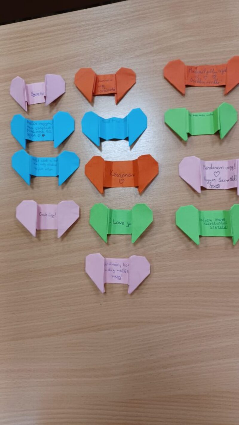 Szeptember 18-án megtartottuk a háláról szóló boldogságóránkat. Bagdi Bella – dallal kezdtünk. A felvezetésben az Egy pohár tej c. történetet beszéltünk meg, így alakítottuk ki a hála fogalmát. A tanulók a motiváló videót vetítettem (Vujicic), ezután a hála, köszönet kérdésköréről igen aktívan nyilvánultak meg a tanulók: kinek, miért, hogyan lehetnek hálásak. Összegyűjtöttük páros munkában, milyen pozitív hatásai lehetnek a hálás életmódnak. Javasoltam a legjobb hála – technikák alkalmazását, beszéltünk a hála napló készítésről. Óra végén mindenki elkészített egy széthúzható hálaszívet, melybe rövid üzenetet írtak a diákok annak, aki iránt hálát éreztek. A szívet oda is adták még aznap, akinek készült a kis ajándék