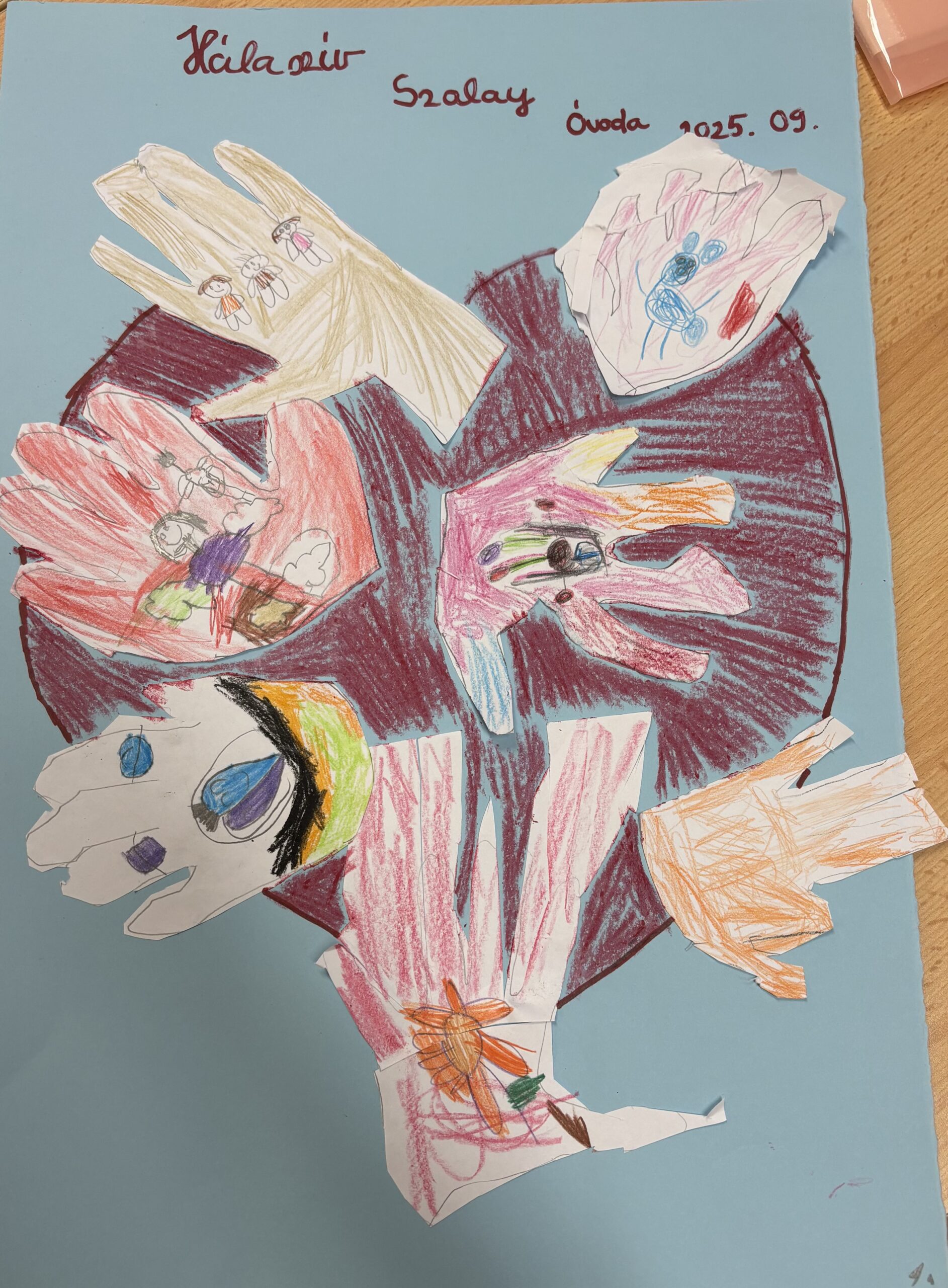 A foglalkozást a Nyújtózd fel érd el az eget című utánzó mozgással kezdtük. A szabad játék ideje alatt a gyerekek körbe rajzolták a kezüket a hála szívhez. A tevékenységgel a téma bevezetése volt a célom és a foglalkozás gördülékenysége. Meghallgattuk a gyerekekkel Bagdi Bella: Szép nap ölelj át engem című dalt. Észrevételem, az , hogy két gyermek akik a minden napok során több figyelmet igénylők megnyugodtak, kikapcsoltak, teljesen átadták magukat a dal mondanivalójának. Ügyességi játék során nem őszi faleveleket adogattunk, hanem diót és gesztenyét. Tetszett nekik a játék, együtt tudtak működni és figyeltek egymásra.