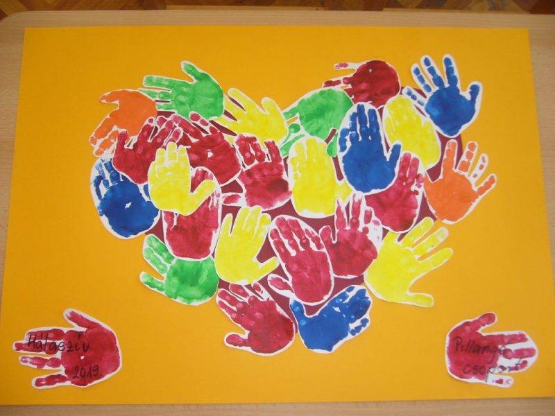 Csoportunkban – 2.5-5 éves gyerekek – Marék Veronika: Első nap az óvodában című meséje segítségével vezettük be a hála fogalmát. A mesében a kis vaddisznó első napját tölti az oviban, amikor játék közben összekeveri társai dolgait. A kisegér siet segítségére, akinek ezért hálából a kis vadmalac három gyönyörű kukorica szemet adott. A mese után beszélgettünk arról, hogy ki, mit szokott megköszönni (miért hálás) és elkészítettük a Pillangó csoport Hálaszívét.