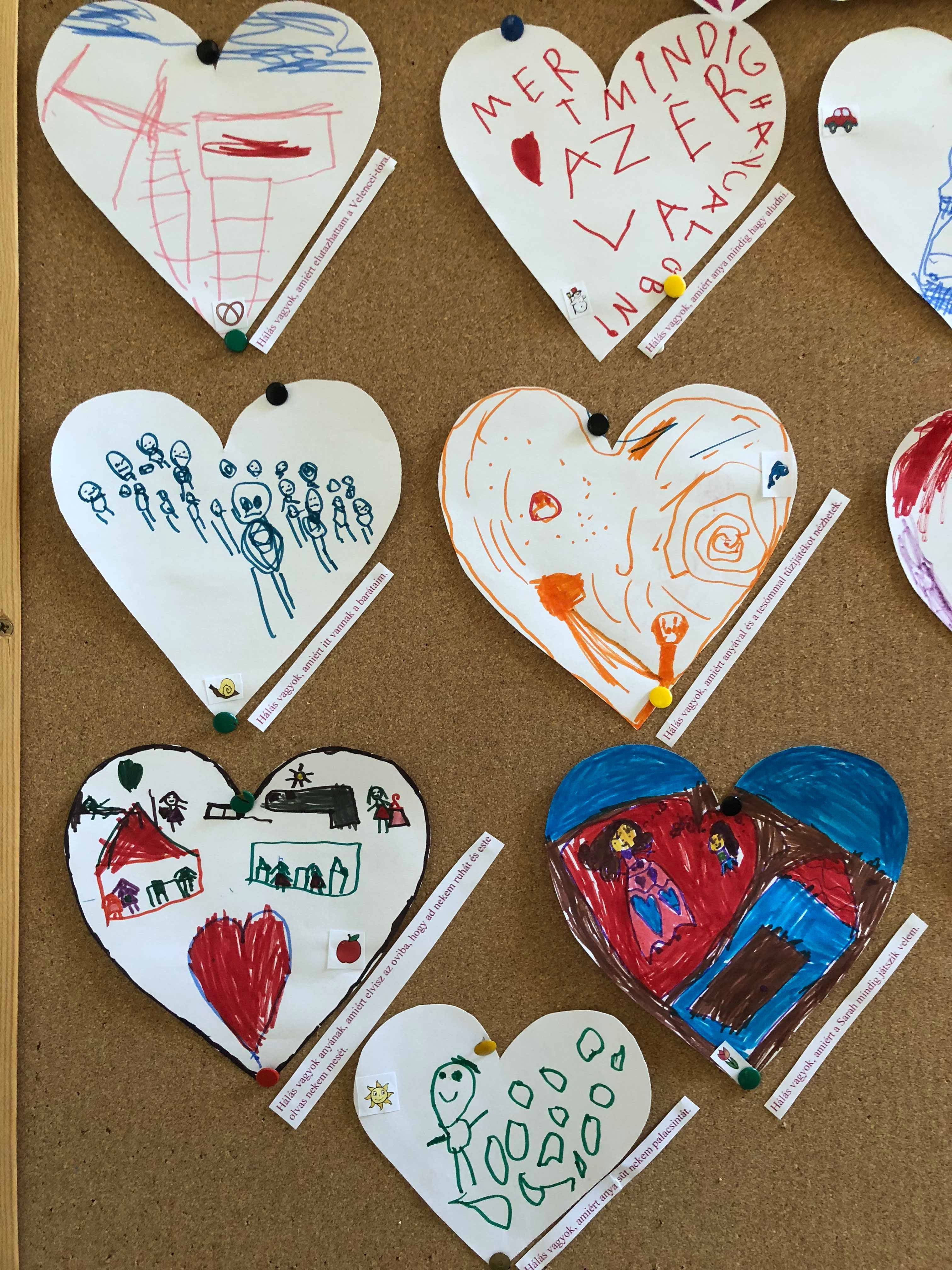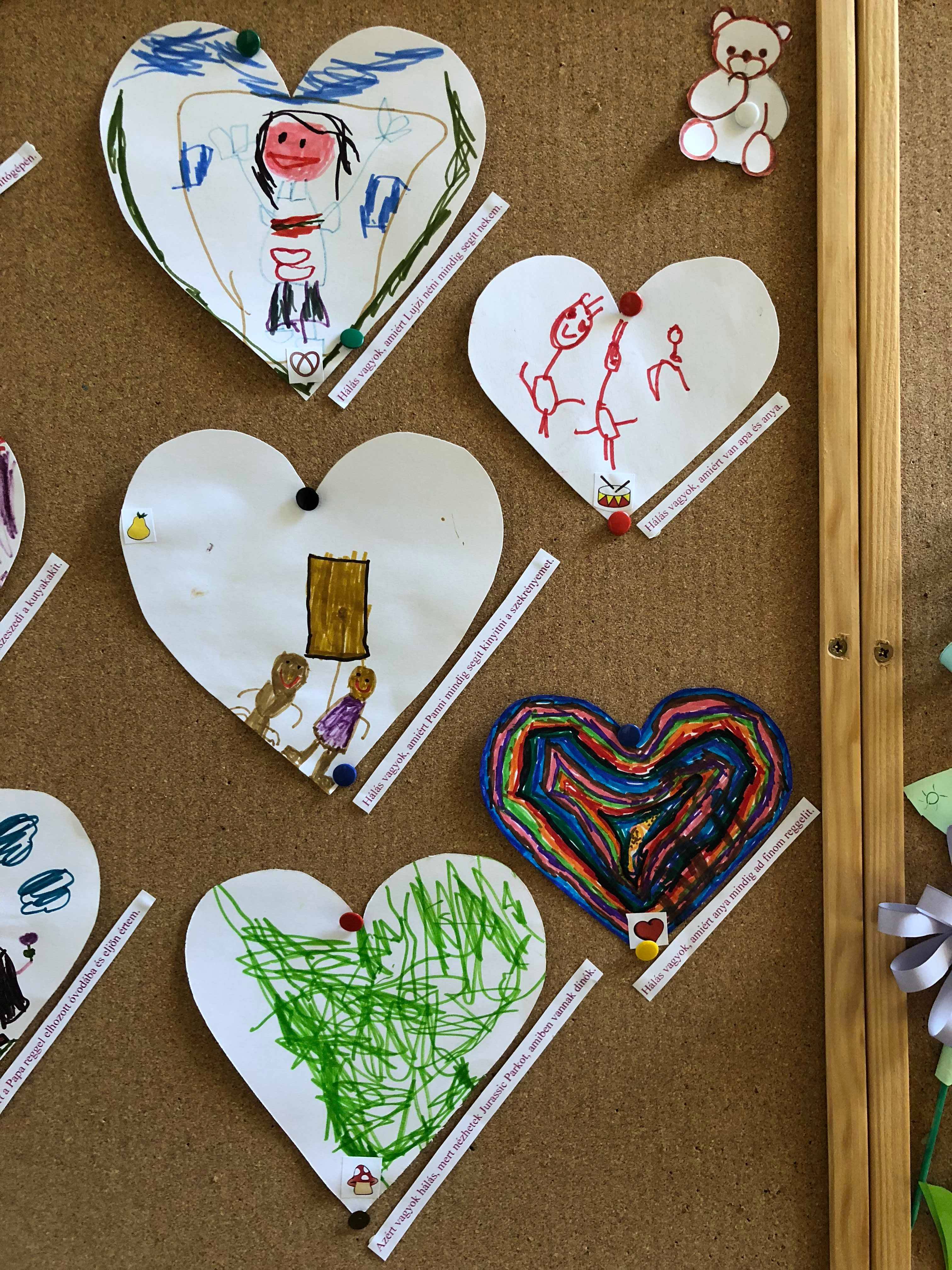Az első témát, a hála témáját lassan vezettem be a csoportba, az első héttől kezdve gyakrabban mondtam nekik a szokásos „Köszönöm” helyett, hogy „Hálás vagyok neked amiért…”. Így könnyebben ismerkedhettek a jelentésével. Ezután egyik reggel a szokásos hangulattáblázás után ajándékkal készültem a gyerekeknek. Mindenkinek készítettem egy hálaszívecskét, amire ráírtam hogy miért vagyok nekik hálás. Ezután ezeket átadtam nekik, felolvastam a rajtuk látható szöveget és egy ölelés kíséretében átadtam nekik. Nagyon jó volt látni, hogy mennyire örültek mennyire megbecsülve érezték magukat. A szívecskék átadása után azt is elmeséltem, hogy mennyire hálás vagyok, hogy ilyen szuper gyerekek járnak a csoportomba és hogy minden napomat velük tölthetem. Erre is óriási mosolyokat kaptam válaszul, aztán pedig megkérdeztem őket, hogy ők miért hálásak az életükben. Itt nagyon kedves válaszokat kaptam. Először legtöbben az anyukájuknak mondtak hálát, de aztán megbeszéltük azt is, hogy az egyszerűbb dolgokért is milyen hálásak lehetünk. Például hogy kisütött ma reggel a nap, hogy egészségesek vagyunk, stb. A beszélgetés során a gyerekek felszabadultak és nagyon jól belemélyültek a témába. Ezután felmutattam az előre kivágott hálaszíveket, és elmondtam, hogy akinek van kedve, az lerajzolhatja hogy miért hálás az életben és ebből készítünk egy közös hálatáblát. Nagy örömömre mindenki kért tőlem szívecskét és azonnal elmélyült munkába kezdtek. Nagyon kedves, szép alkotások születtek.