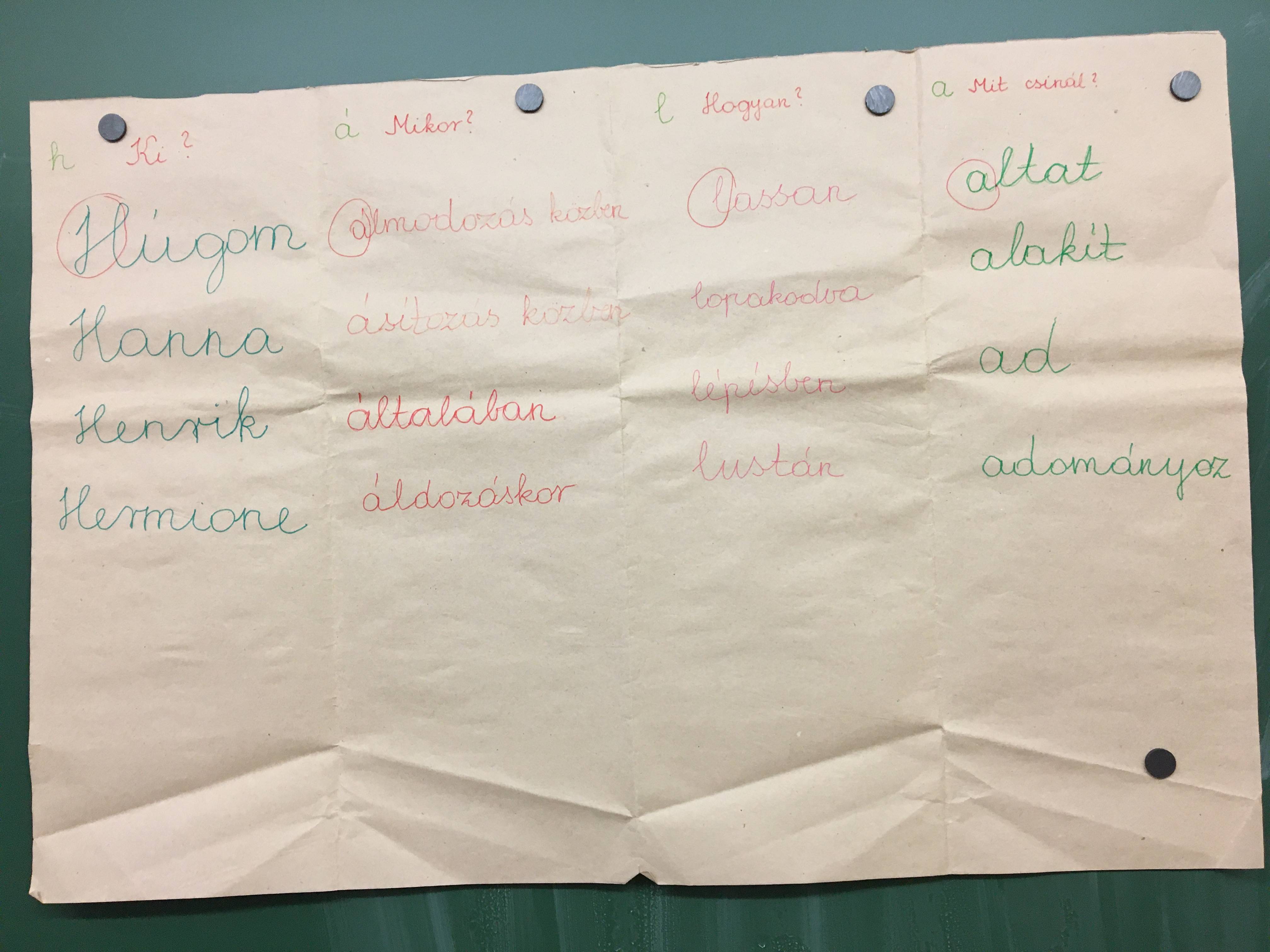 Az órát beszélgetéssel kezdtük. Felelevenítettük a boldogságórák témaköreit, majd meghallgattuk a hónap dalát. A következő feladathoz körbe raktuk a székeket az osztályban. Egy tanuló kezébe adtam egy gombolyagot, aki befejezte az általam elkezdett mondatot: Hálás vagyok, mert megtörtént velem az, hogy…., majd átdobta a gombolyagot egy másik tanulónak, így létrehoztuk az osztály hála hálóját. Ezután egy csomagolópapírra felírtam a hála szó betűivel gyűjtött szavakat, majd összeolvastuk a sorokat. A tanulók jól szórakoztak a vicces mondatokon. A következő feladathoz egy széket kivettünk a körből, majd eljátszottuk a „Nagy szél fúj” kezdetű játékot. Sok, a hála témakörével kapcsolatos állítást gyűjtöttünk.