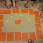13 éves kamaszokról írok, és ennek megfelelően a foglalkozás közben a reakció első pillanatban vegyes volt. A beszélgetés után kiosztottam narancsszínű lapokat, melyekre felírták miért hálásak. Aki gyorsabb volt, az kapott kis színes lapot, és egy betűt, melyet a felirathoz ki kellett vágni. Majd a lapokból és a betűkből tablót készítettünk. Ennek fotóját töltöttem fel.