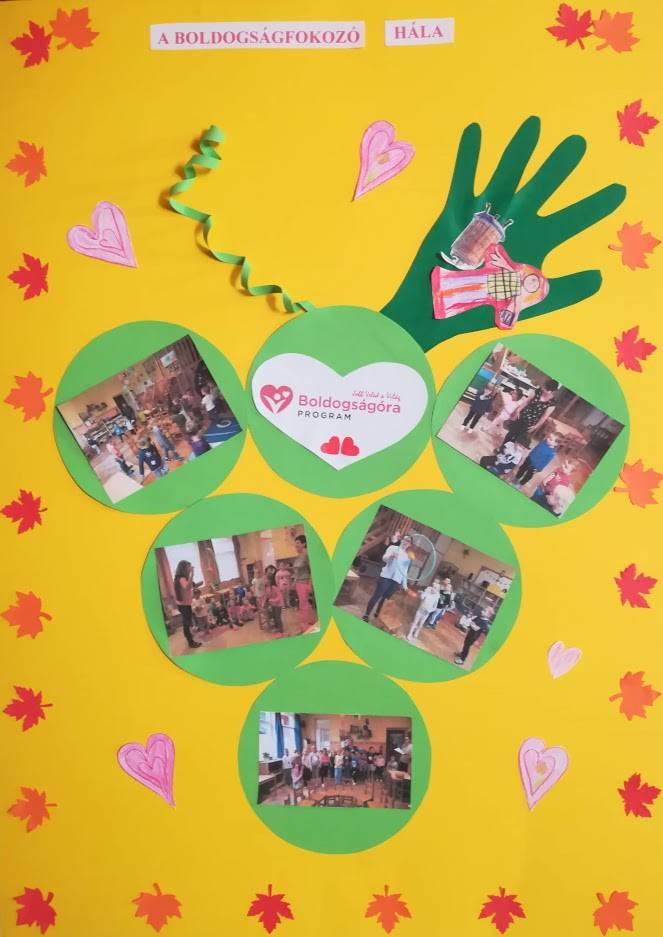 Az őszi szüreti napon számtalan dologért voltak hálásak kisóvodásaink, amit fényképekkel örökítettünk meg, s rajzokkal egészítettünk ki. Az óvó nénik meséje mulatságosan szórakoztató volt, a mozgásos feladatok végzése közben határtalan boldogságot, vidámságot éreztünk. Hálát mondtak azok is, akiket csősznek választottak társaik. Jó érzés volt kitalálni a találós kérdéseket, lelkesen mondtuk, énekeltük együtt a szüreti mondókákat dalokat. Örömmel hallgattuk a kopogó dió muzsikáló hangját. Az édes mustért is köszönetet mondhattunk. A legjobb mégis az volt ezen a napon, hogy ezt a sok örömöt együtt élhettük meg.