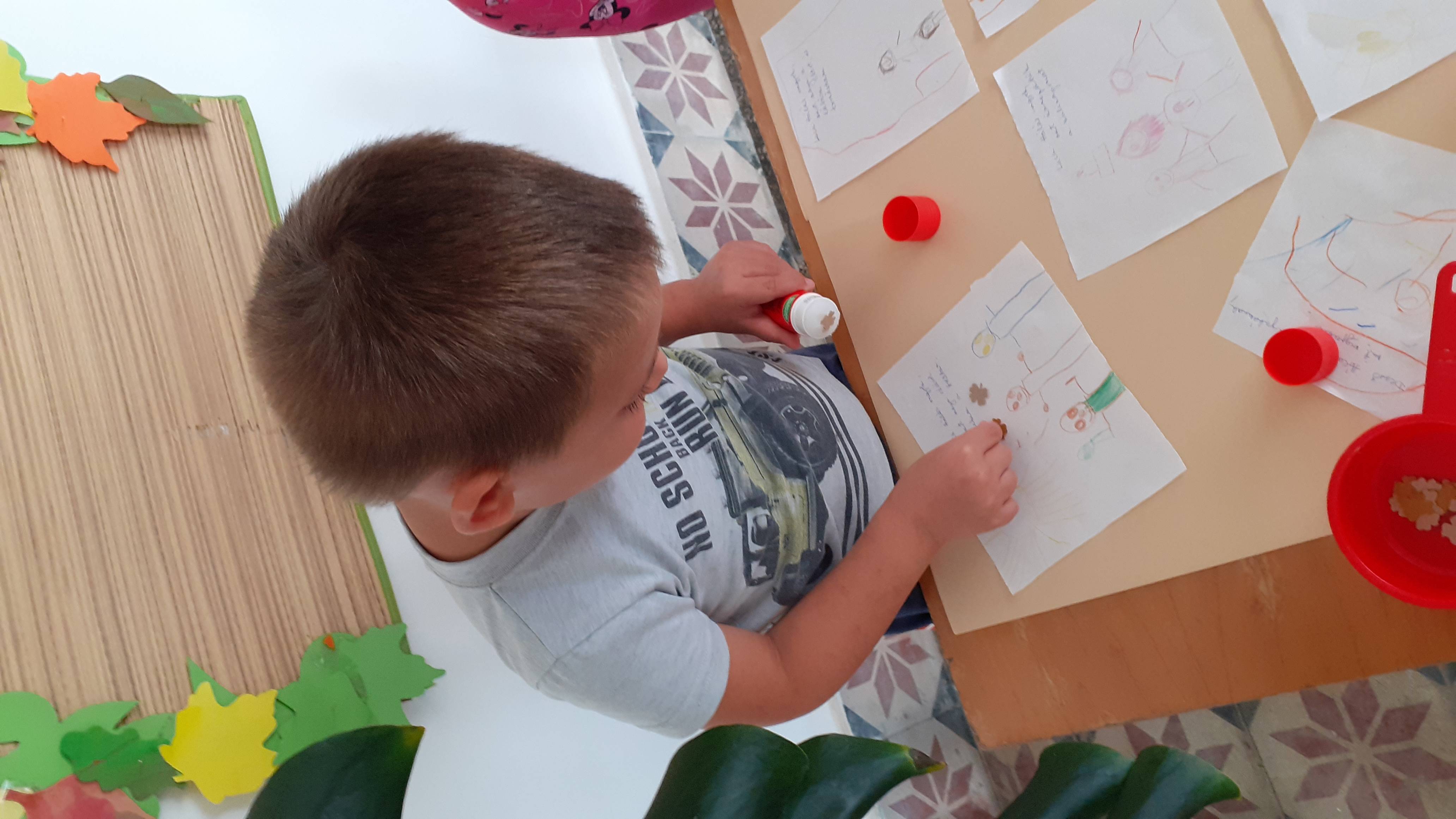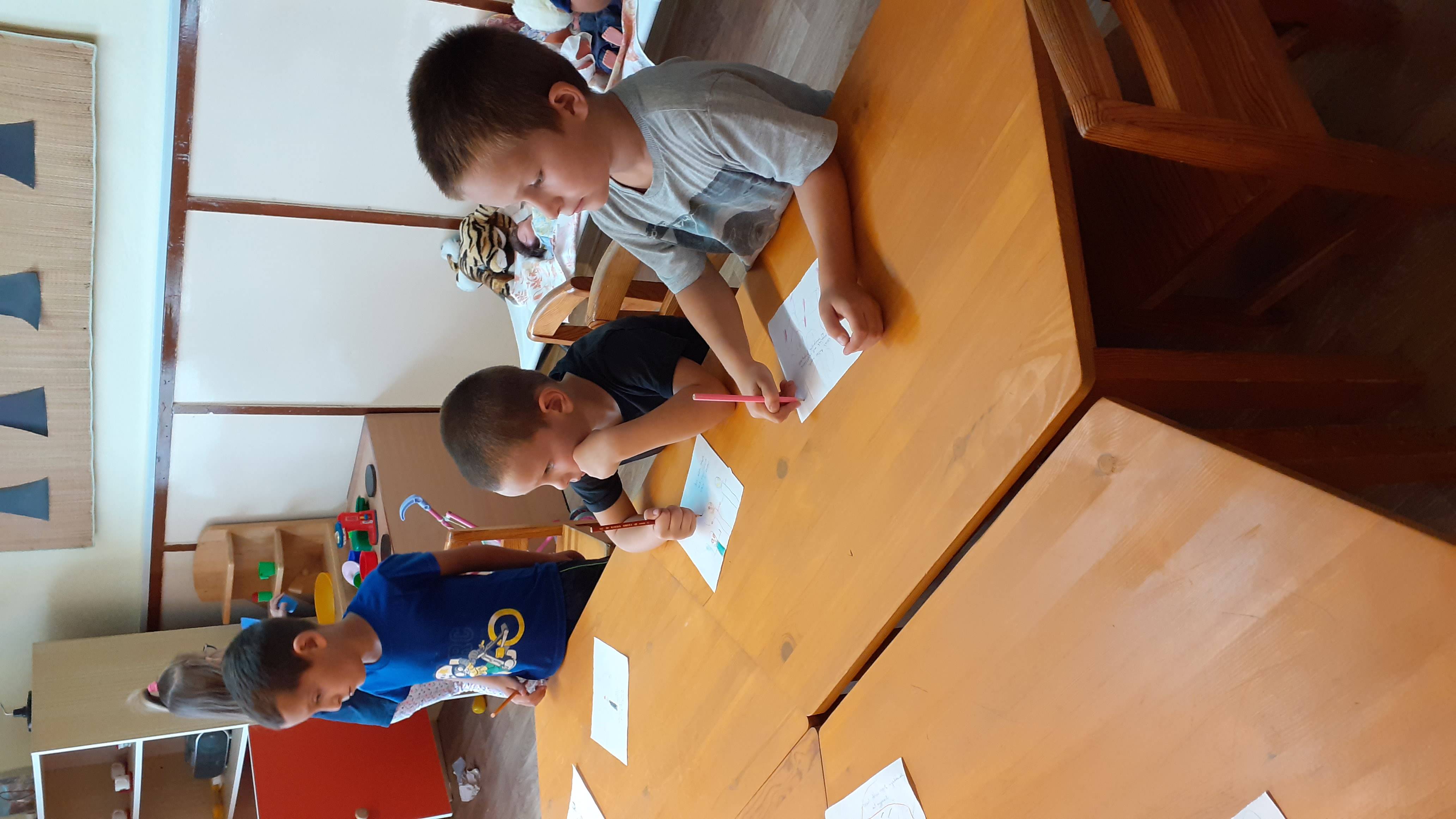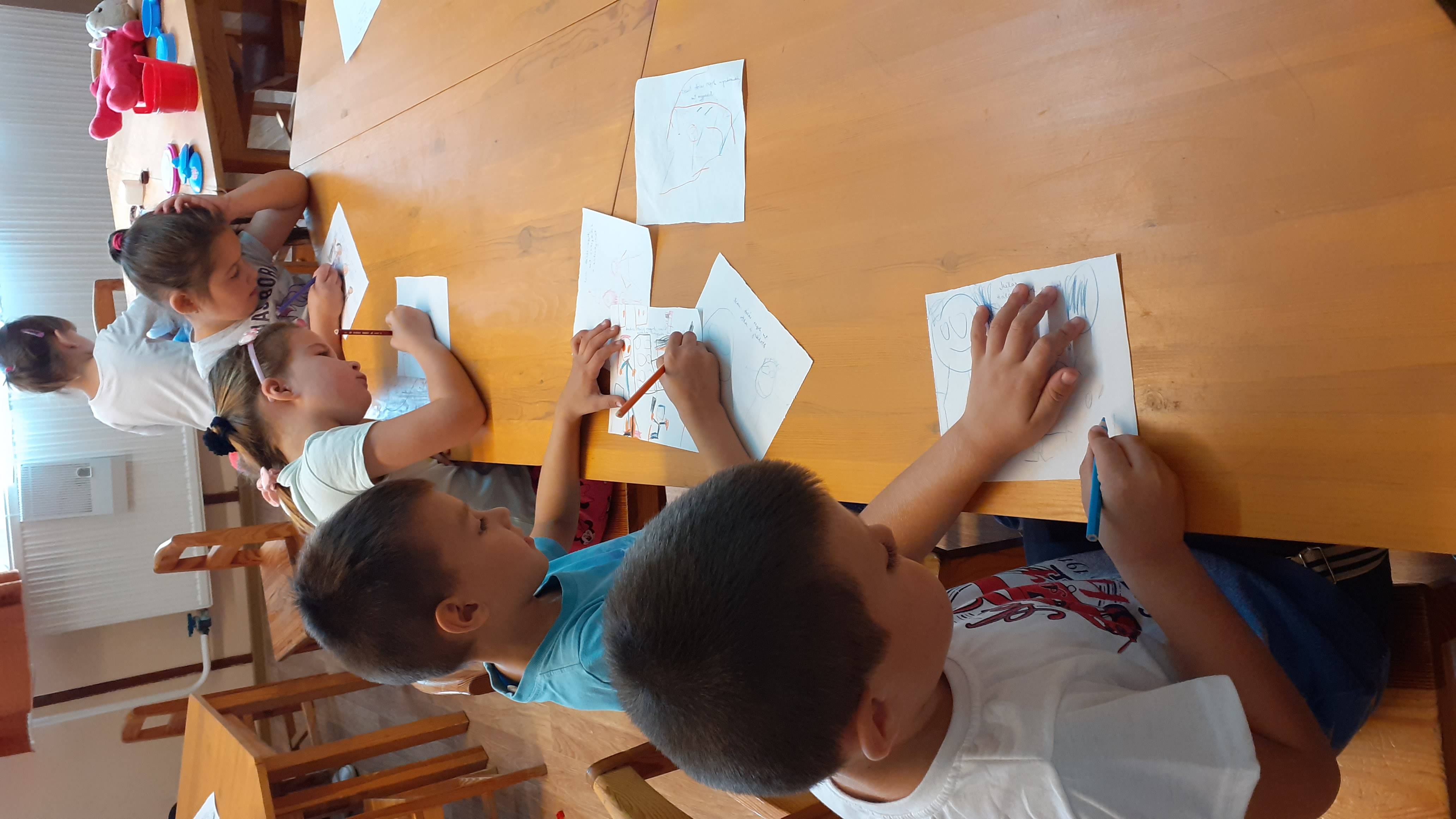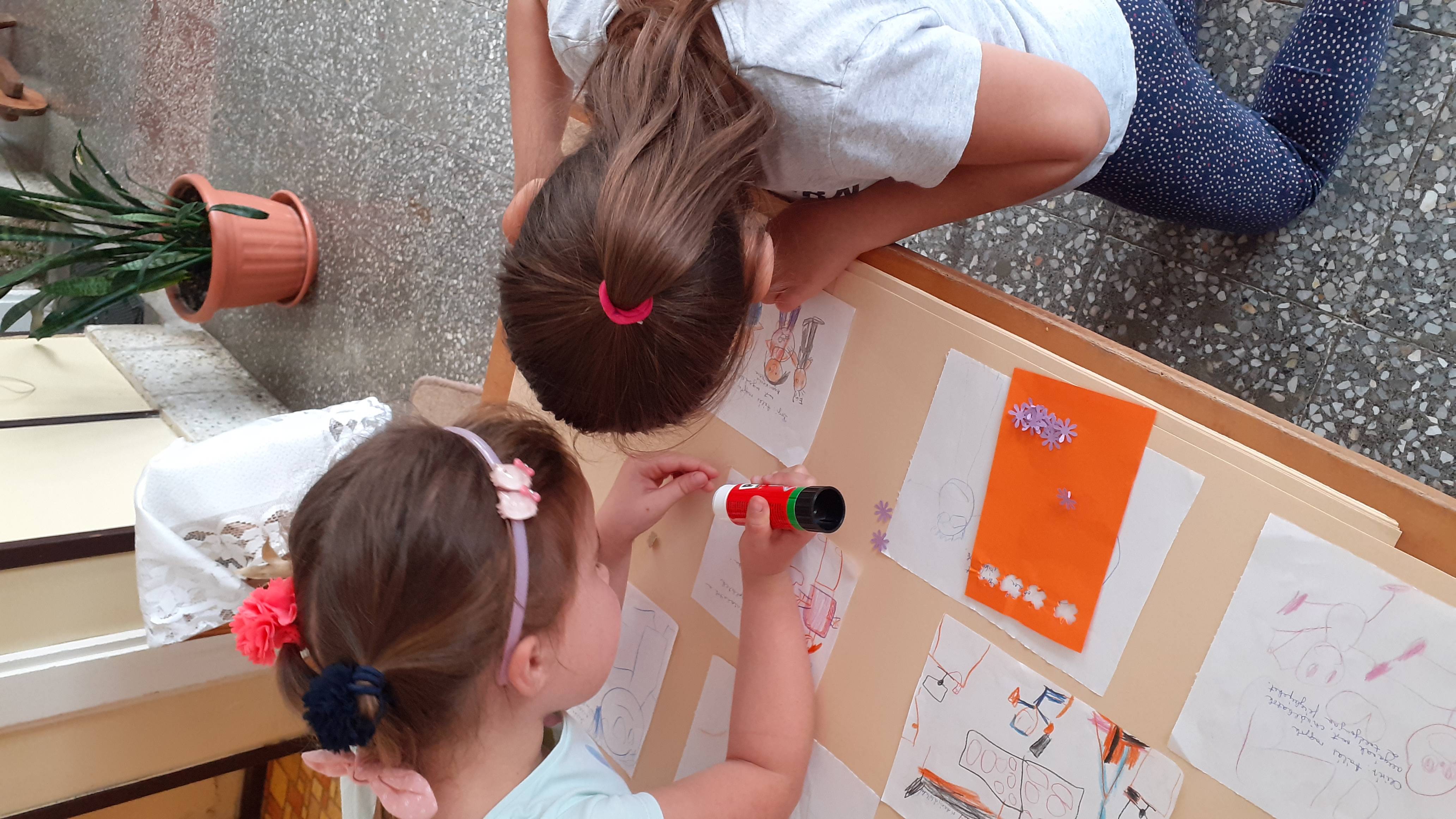 A rajzoknál, ragasztásnál, egyéb barkácsolós feladatoknál a vállalkozó kedvű kisebbek is segítenek.