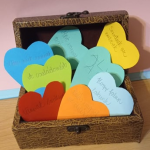 Közösen összegyűjtöttük, mi mindenért lehetünk hálásak, majd elkészítettük a csoport hálaládikáját. Színes papírokból szívecskéket vágtunk ki és rájuk írtuk, hogy miért érzünk hálát a szívünkben. A szívecskéket a hálaládikában helyeztük el, amibe az év folyamán bármikor lehet majd újabb szíveket helyezni mindazért, amiért köszönetet érzünk.