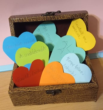 Közösen összegyűjtöttük, mi mindenért lehetünk hálásak, majd elkészítettük a csoport hálaládikáját. Színes papírokból szívecskéket vágtunk ki és rájuk írtuk, hogy miért érzünk hálát a szívünkben. A szívecskéket a hálaládikában helyeztük el, amibe az év folyamán bármikor lehet majd újabb szíveket helyezni mindazért, amiért köszönetet érzünk.