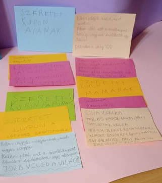 Végül, hogy minél több mindenkihez elérjünk és bennük is jó érzéseket keltsünk, Bella gyerekdalainak hallgatása közben, szeretetkuponokat készítettünk a családtagjainknak és/vagy legjobb barátunknak, barátnőnknek.