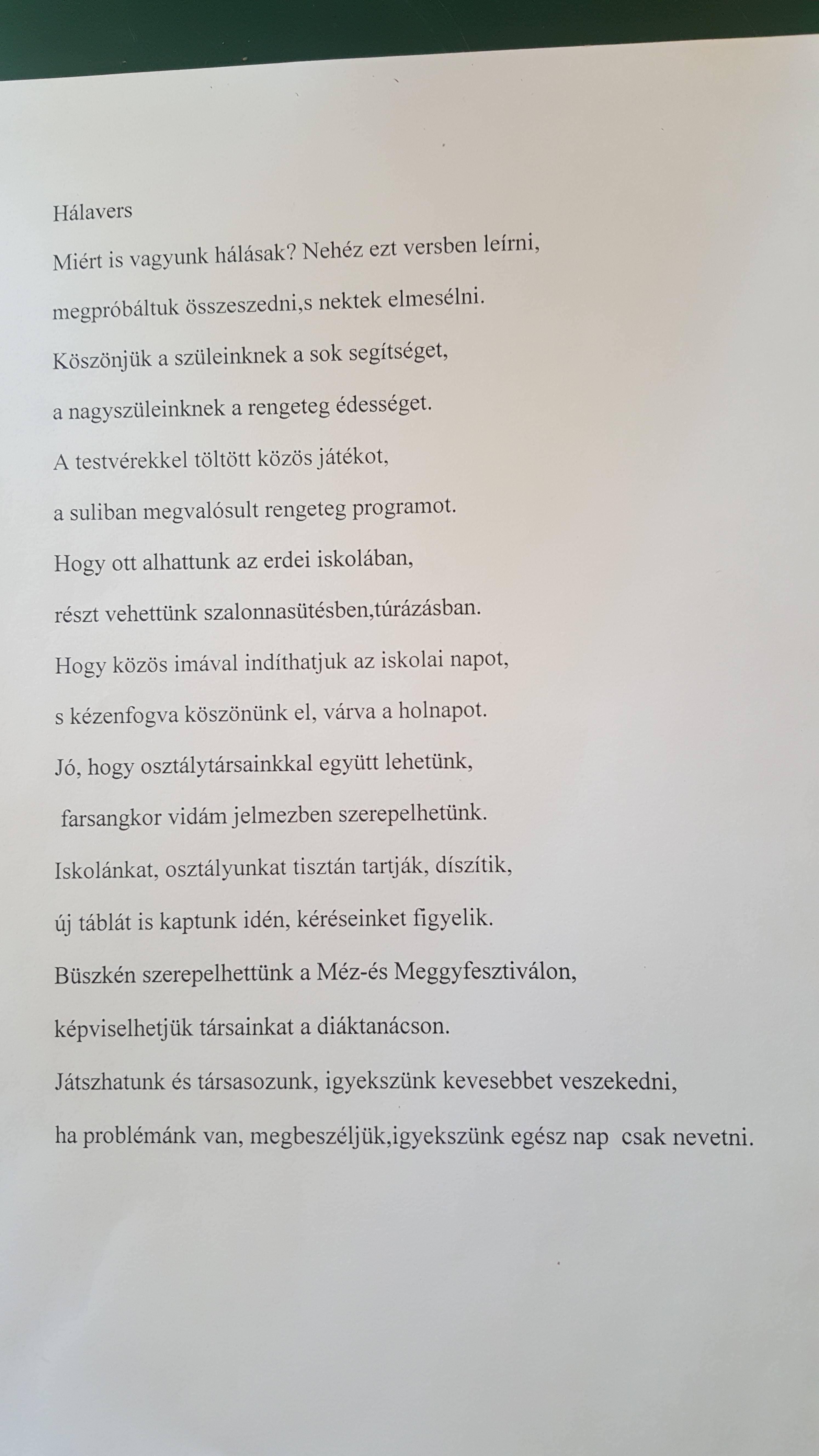 Az osztályunk már negyedikes lett ebben a tanévben,így lelkesen választottuk ki közösen a lehetőségek közül a versírást.Sok szó került a hálatarsolyunkba, rímekbe szedni nehezebben ment,mint gondoltuk, de megoldottuk!