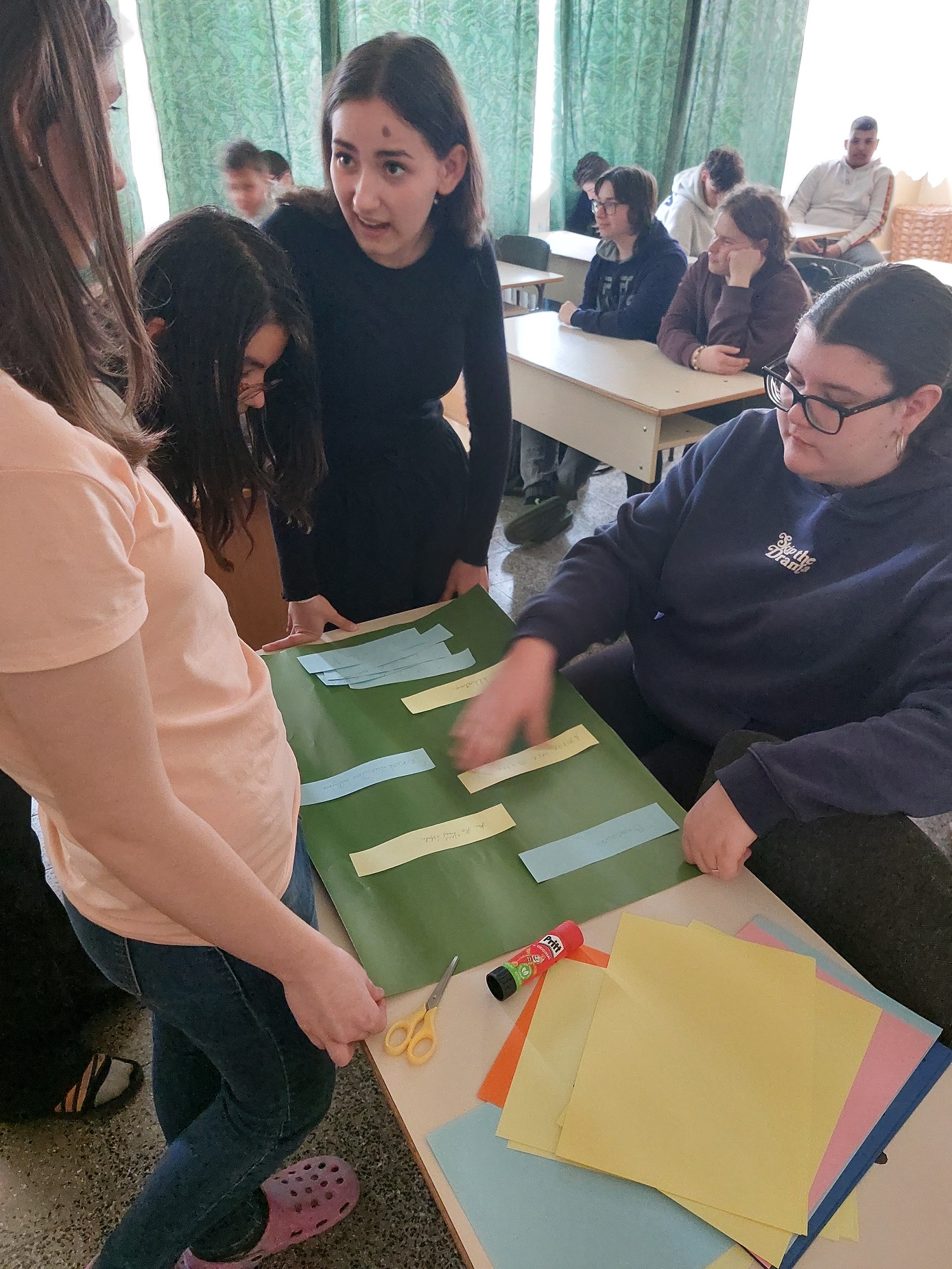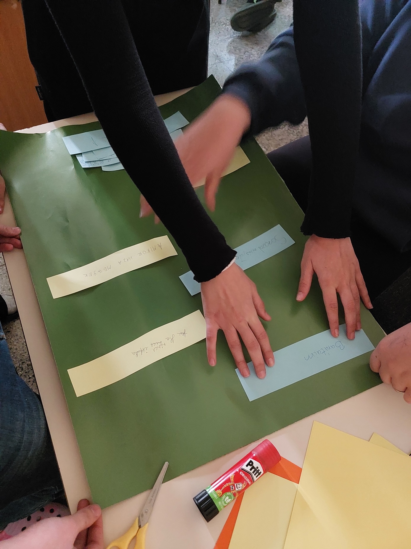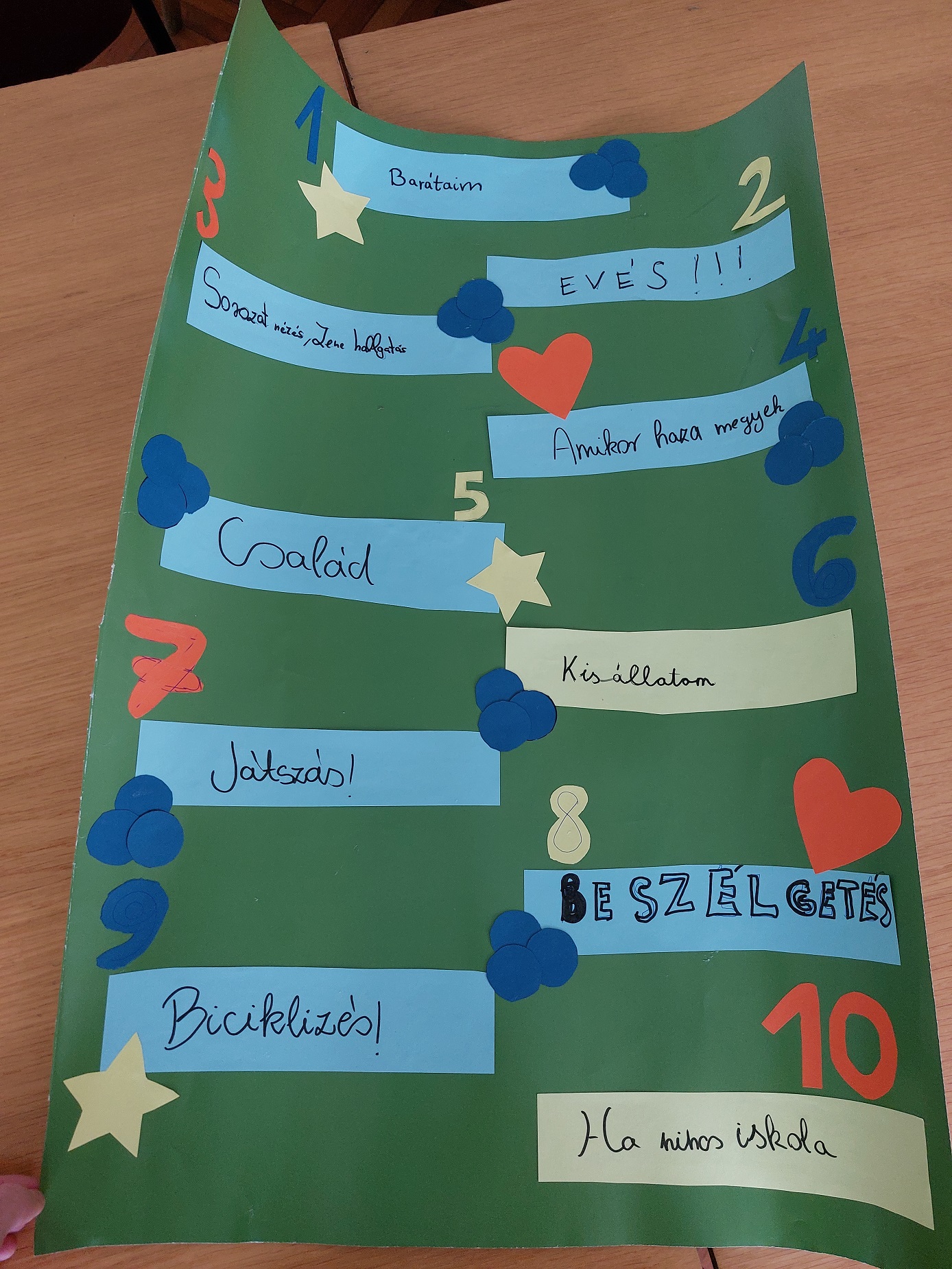 A márciusi boldogságóra témája az apró örömök volt. Először egy nyitott beszélgetéssel kezdtük arról, hogy kinek mi ad örömet a mindennapokban, mik azok a mindennapi apróságok, amelyek jó érzéssel töltenek el minket. Megbeszéltük azt is, hogy melyek azok a dolgok, amelyek nem kerülnek pénzbe, de mégis örömet okoznak. Beszéltünk a flow-élményről is, amikor valamilyen tevékenység teljesen kikapcsol és nagy örömmel tölt el. Ezt követően mindenki írt egy-egy mindennapi örömöt a kis lapjára, majd ezekből kiválogattuk azt a tizet, amivel a legtöbben egyetértettünk. Ezekből készítettek közösen a gyerekek egy plakátot, amin egy tizes listát állítottak fel.