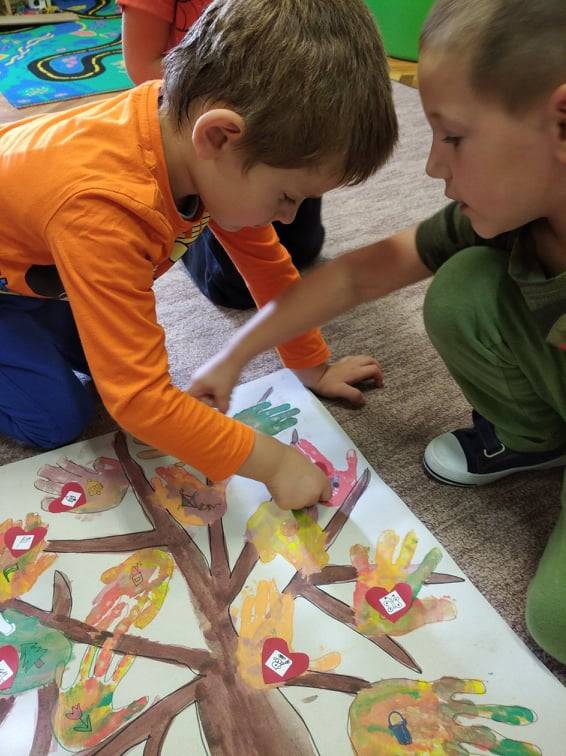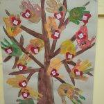 Első alkalommal a hálafa történetével ismerkedtünk meg, ezután mi is elkészítettük a csoport hálafáját. A fánkon a leveleket színes tenyérlenyomattal készítettük,majd rákerült egy hála szívecske a jelükkel.A szív a gyerekeknek a szeretetet jelképezi.
