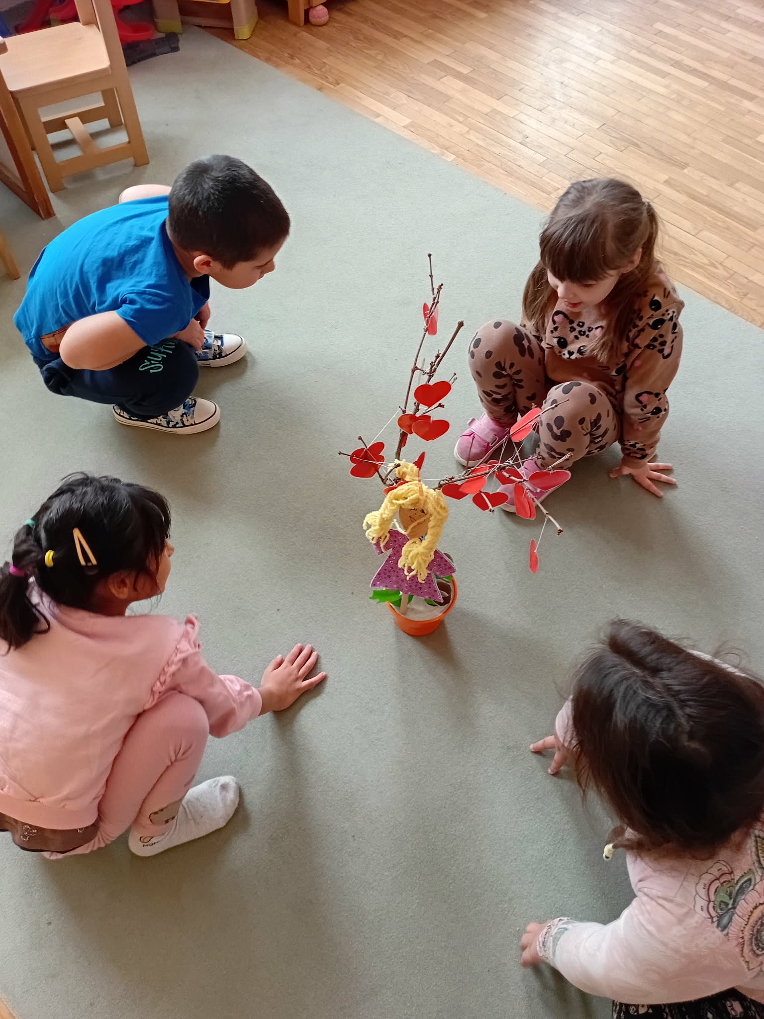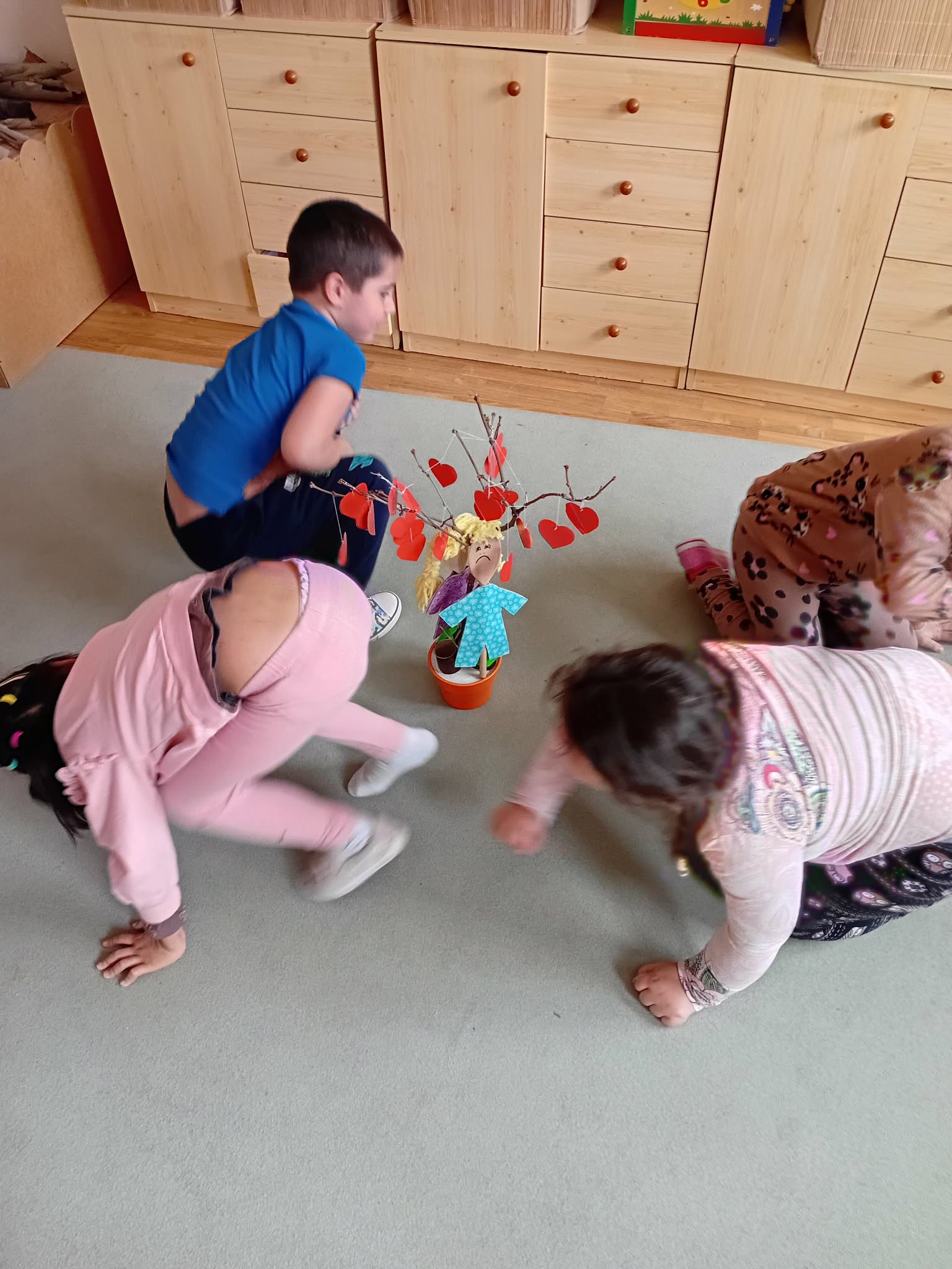 A foglalkozást, az „Almát szedj, ügyesedj, szőlőt szedj, ügyesedj…” relaxációs gyakorlattal indítottuk, majd Bagdi Bella: Pozitív gyerek vagyok című dalát meghallgattuk. Körbe járva, táncoltunk. A zenére törpe és óriás járással bejártuk a csoportszobát. A mozgásos játékból kezdeményeztem a Bezzeg Andrea: „Tódi törpe: Szebben látó mondókája” című vers meghallgatását. Ennek kapcsán beszélgettünk a pozitív életszemléletről, az optimista gondolkodásmódról, majd elkészítettük a varázsszemüvegeket, melyeket azonnal kipróbáltuk. Elmondtuk, hogy hogyan tudjuk mindennek a jó oldalát észrevenni, meglátni, illetve hogyan tudjuk jóra fordítani a történetet. Elkészítettük a Szomorú Szilárd és Boldog Blanka bábokat is. A hónap során, többször elővettük a „varázsszemüveget”, amit az adott helyzetekben, többek között a gyermekek bátorítására, ösztönzésére használtunk. Végül, az optimizmus jelét felhelyeztük a lépcsőnkre.