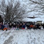 Szerencsére az iskola udvarán van lehetőség a hóval borított dombról csúszkálni.