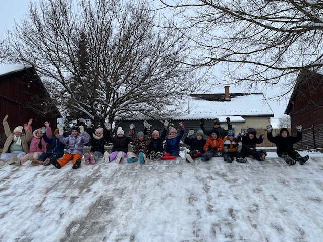 Szerencsére az iskola udvarán van lehetőség a hóval borított dombról csúszkálni.