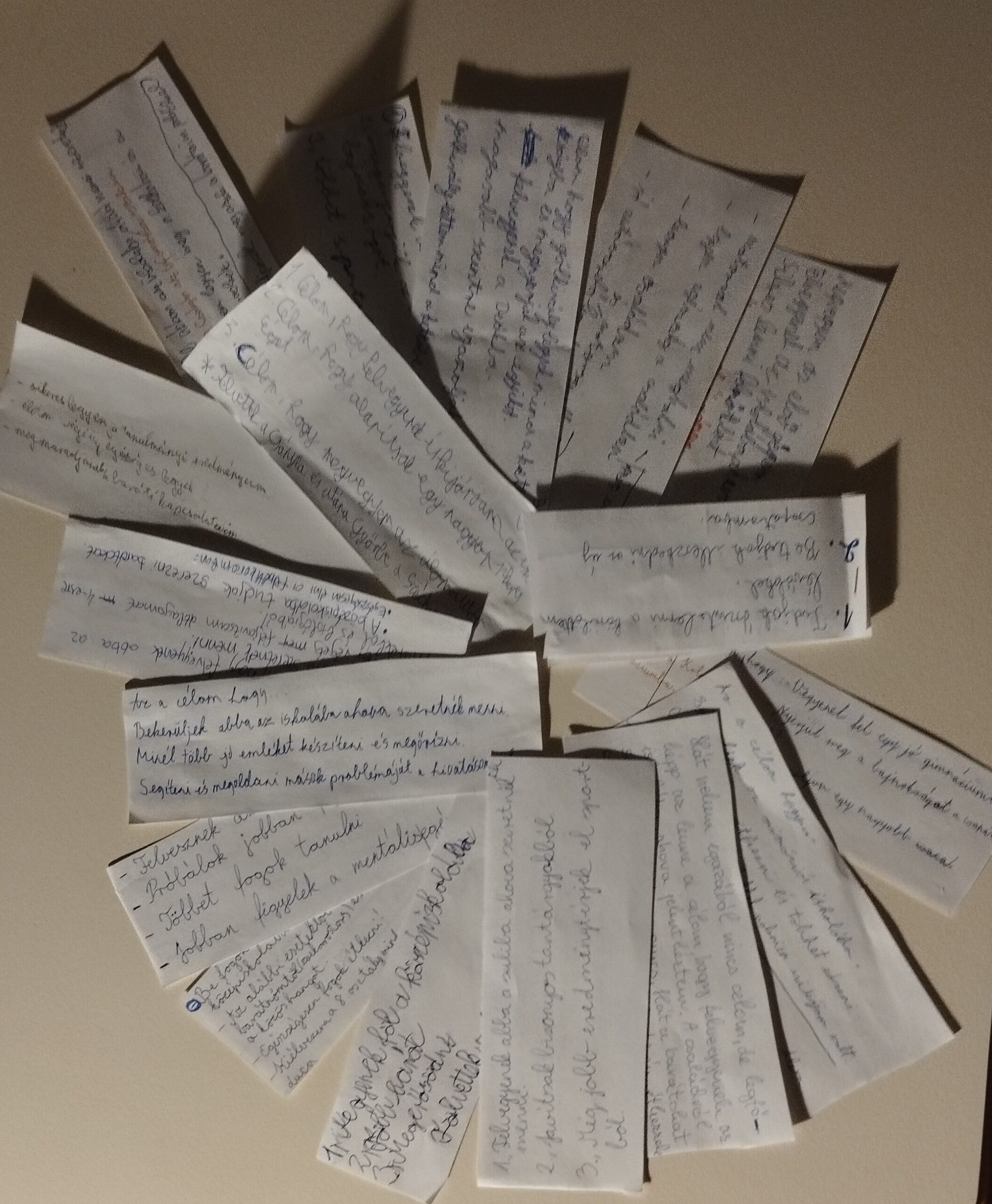 5. A személyes célok mellett a közösség legfontosabb célját is megfogalmazták. Egy – a csoport nagy részét érintő, felkavaró – esemény kapcsán sokat beszélgettünk, mindenki feltárta ezzel kapcsolatos érzéseit, sérelmeit, megoldásokat kerestünk, s megfogalmazódott mindenkiben a legfontosabb cél: a bizalom, a közösségi kapcsolatok, az egyensúly helyreállítása.