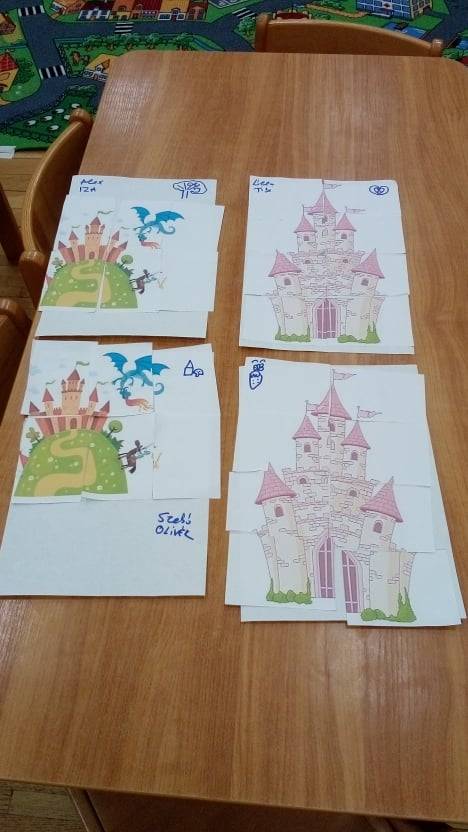 A mesét kérdések és válaszok formájában dolgoztuk fel. Ezek után egy kinyomtatott vár darabjait kellett a gyetrekeknek megkeresni a csoportszobába, amit utánna felragasztottunk a falra is.