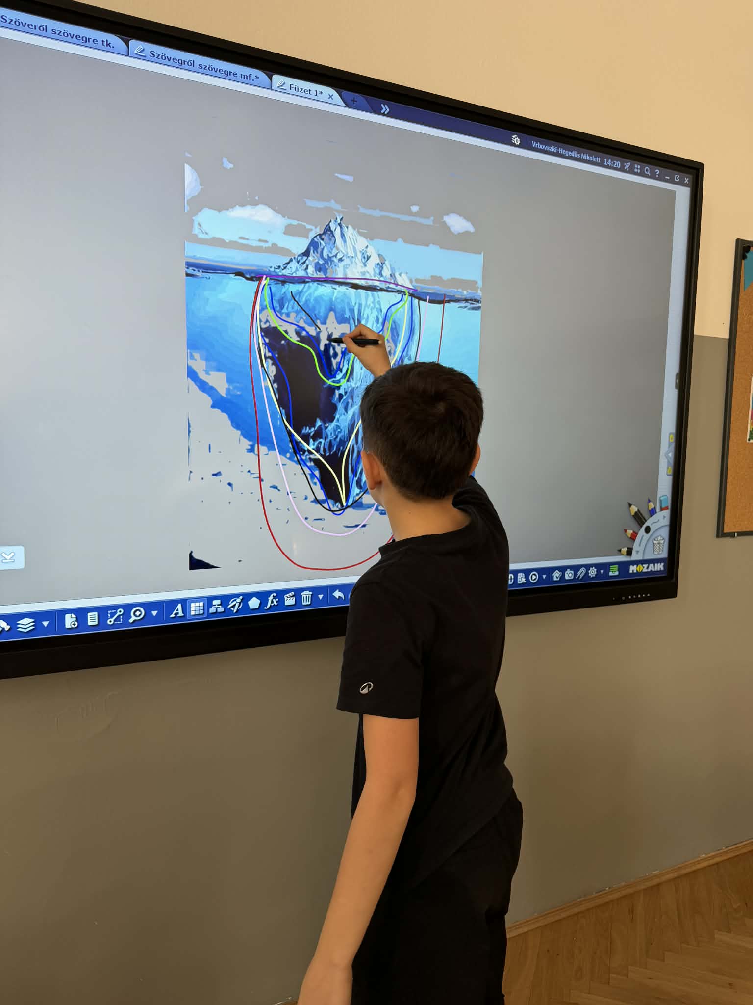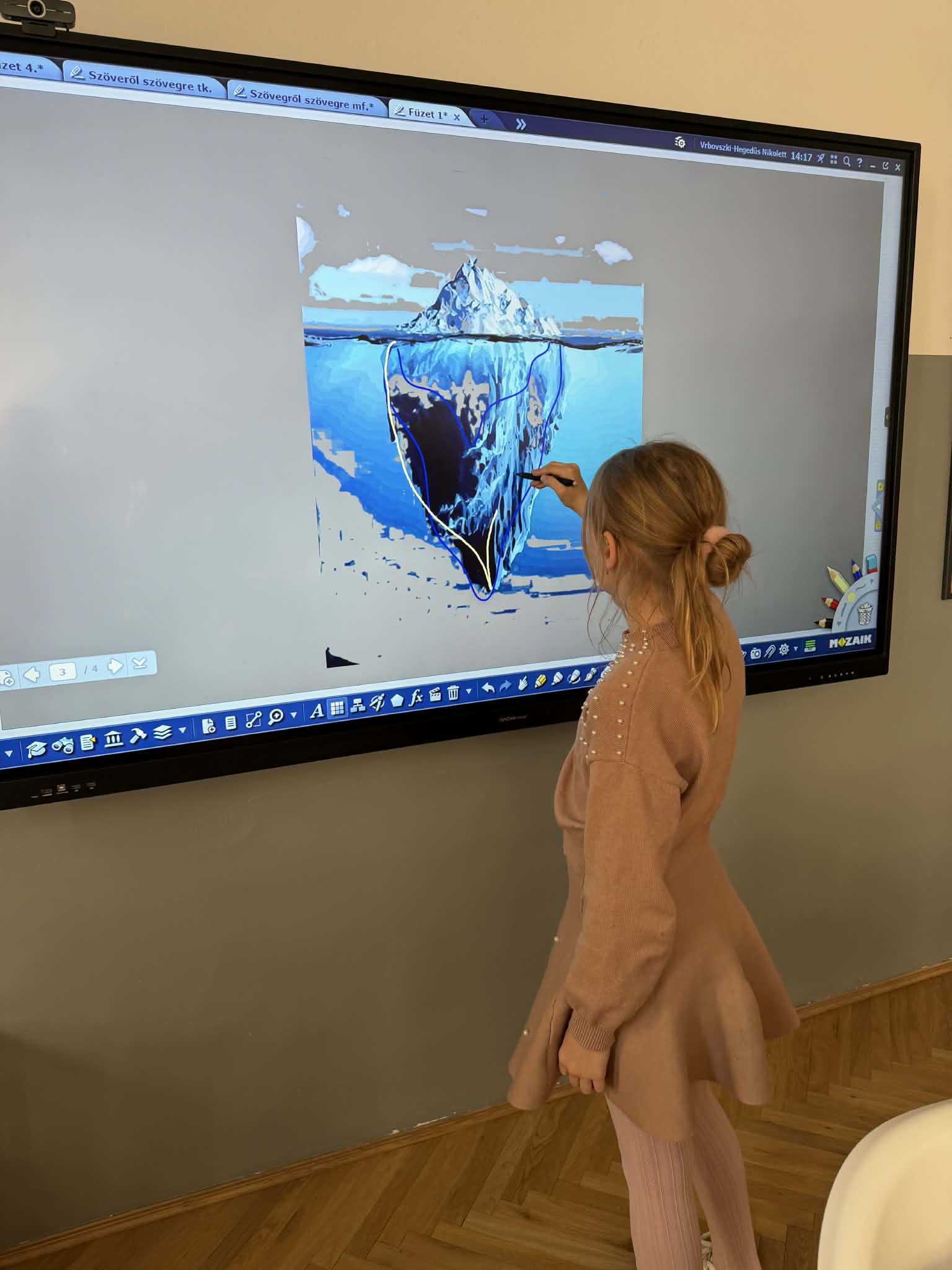 A következő feladatban a gyerekek közül azok, akik szerettek volna, kijöhettek a táblához, és berajzolhatták egy jéghegybe, hogy van-e problémájuk, és ha igen, az mennyire nagy vagy mély. A feladat során sokan meglepődtek egymás érzésein, és többen megosztották saját nehézségeiket. Volt, aki arról beszélt, hogy meghalt a cicája, más arról, hogy összeveszett a barátjával, vagy hogy megszületett egy kistestvére, és most úgy érzi, kevesebb figyelmet kap.