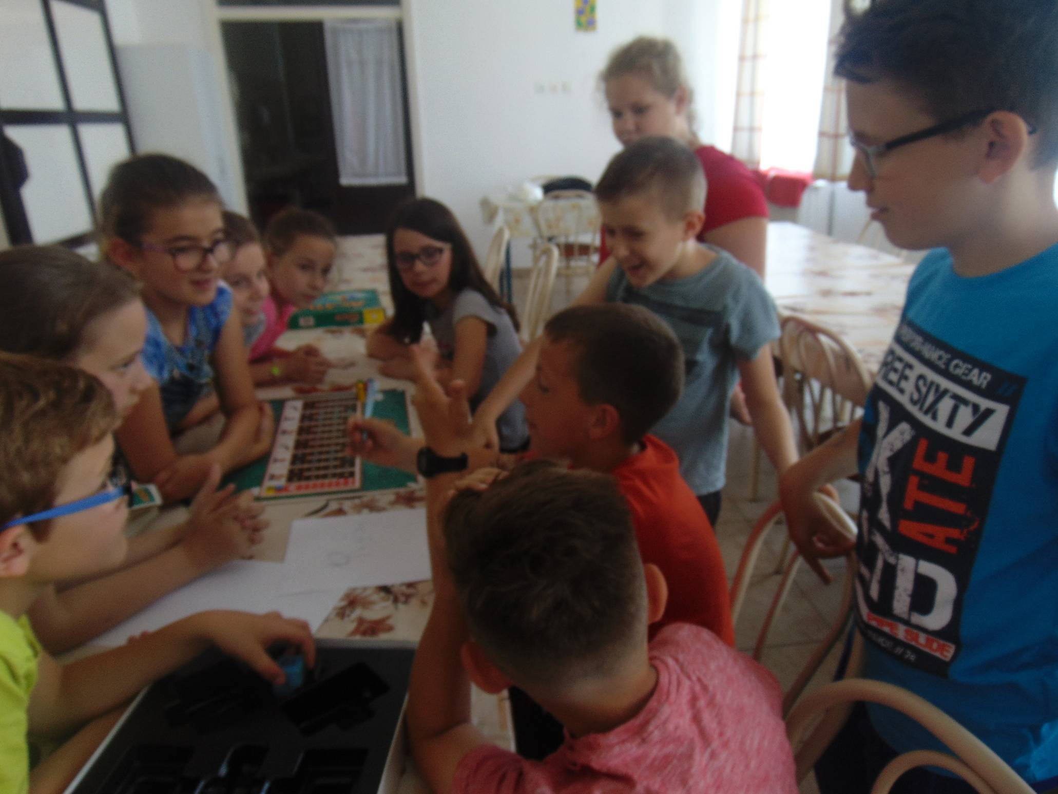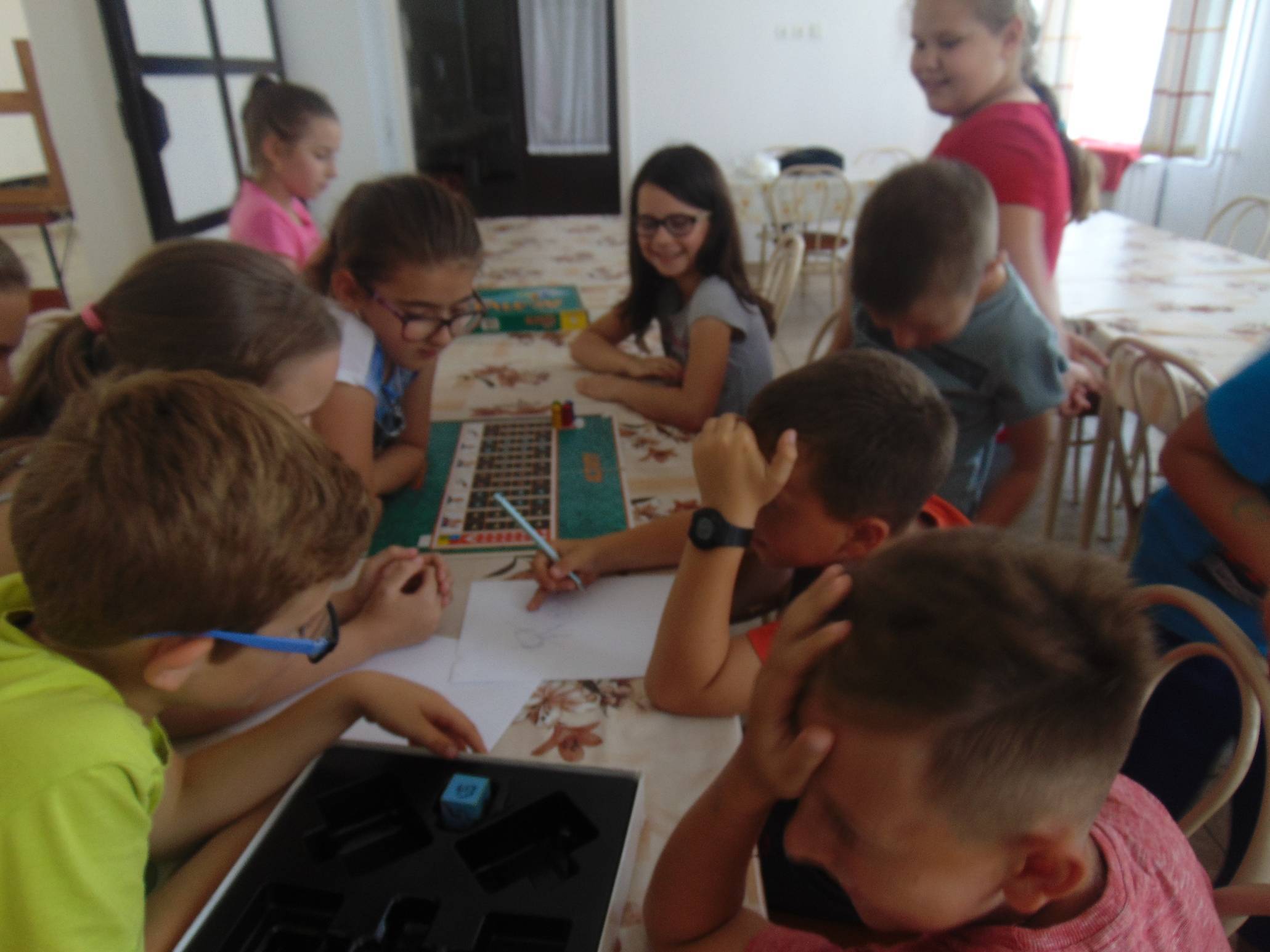 Az utolsó alkalommal szerettünk volna valami igazán gyerekeknek való témát találni, ahol minden gyereknek jut olyan feladat, amelyet szívesen végez, nem utasít el. Ezért az Activity társasjátékot vettük elő, melyben a gyerekek rajzolhattak, mutogathattak, illetve körülírhattak különféle dolgokat, fogalmakat, tárgyakat. Négy fős csoportokban alakultak meg a csapatok, így mindig volt gyerek aki 1-1 témában kipróbálhatta magát. A játék jól sikerült, sok nevetést hallhattunk, örömteli pillanatokat élhettünk át ezen alkalom során is. 🙂