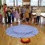 Majd egy ládikát adtunk kézről-kézre, ritmusra, mialatt az „Itt a láda, mi van benne? / Apró öröm a kezembe! / Add tovább! Add tovább! / Te fizesd meg az árát!” mondókát skandáltuk. A ládikában kis képek voltak. Akinek az utolsó ütemre a kezébe jutott a ládika, az kivehetett belőle egy kis képet, ami ábrázol egy dolgot azok közül, amit az Öröm forrásához vezető úton észre kell vegyünk: bagoly, fakopács, pillangó, katicabogár, díszes kavics, gólya, és végül maga az Öröm forrása.