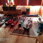 Előkészület: lesötétítettem a csoportszobát és halk zenét kapcsoltam. Lefeküdtem a szőnyegre és a gyerekeket hívtam, hogy csatlakozzanak. Ezután egy vezetett meditációval mentünk el a mesék birodalmába, ahol Az aranykulcs meséjével találkoztunk. A zenét lekapcsoltam és elkezdtem a mesét. Hogy a gyermekek jobban átéljék a mesét interaktívvá tettük. Vándoroltunk….fújtunk, mint a szél….dobbantottunk, mint a sárkány…..találgattuk mi lehetett a legfinomabb reggeli….mié volt az aranykulcs. A mese végén az érzésekről beszélgettünk. Ki mikor érzett szomorúságot, boldogságot? Miután mindenki elmesélte, hogy mikor érzett boldogságot (esemény, ami vele történt), kiosztottam a gyerekeknek az általam előre megrajzolt emberkét. Nemrég a testrészek ill. a héten a betegség-egészség volt a heti témánk, így már beszéltünk róla, hogy nemcsak a bacilusok által kapott betegség betegség, hanem a lelki betegség is az. A négy színt kiválasztottuk az érzelemek színezéséhez és mindenki kiszínezte az emberkéjét aszerint, hogy hol érez a testében jót vagy rosszat. Hol önti el valami különös érzés, ha boldog, ha szeret, ha fél vagy ha szomorú. Ezután az emberkéből királyfit csináltunk, hozzá királylányt és a következő héten, a mesék hetén sárkányt készítettünk. A téma levezetéseként elbáboztuk a mesét. A bábokat senki nem vitte haza, így bármikor szabadon játszhatnak vele a gyerekek.
