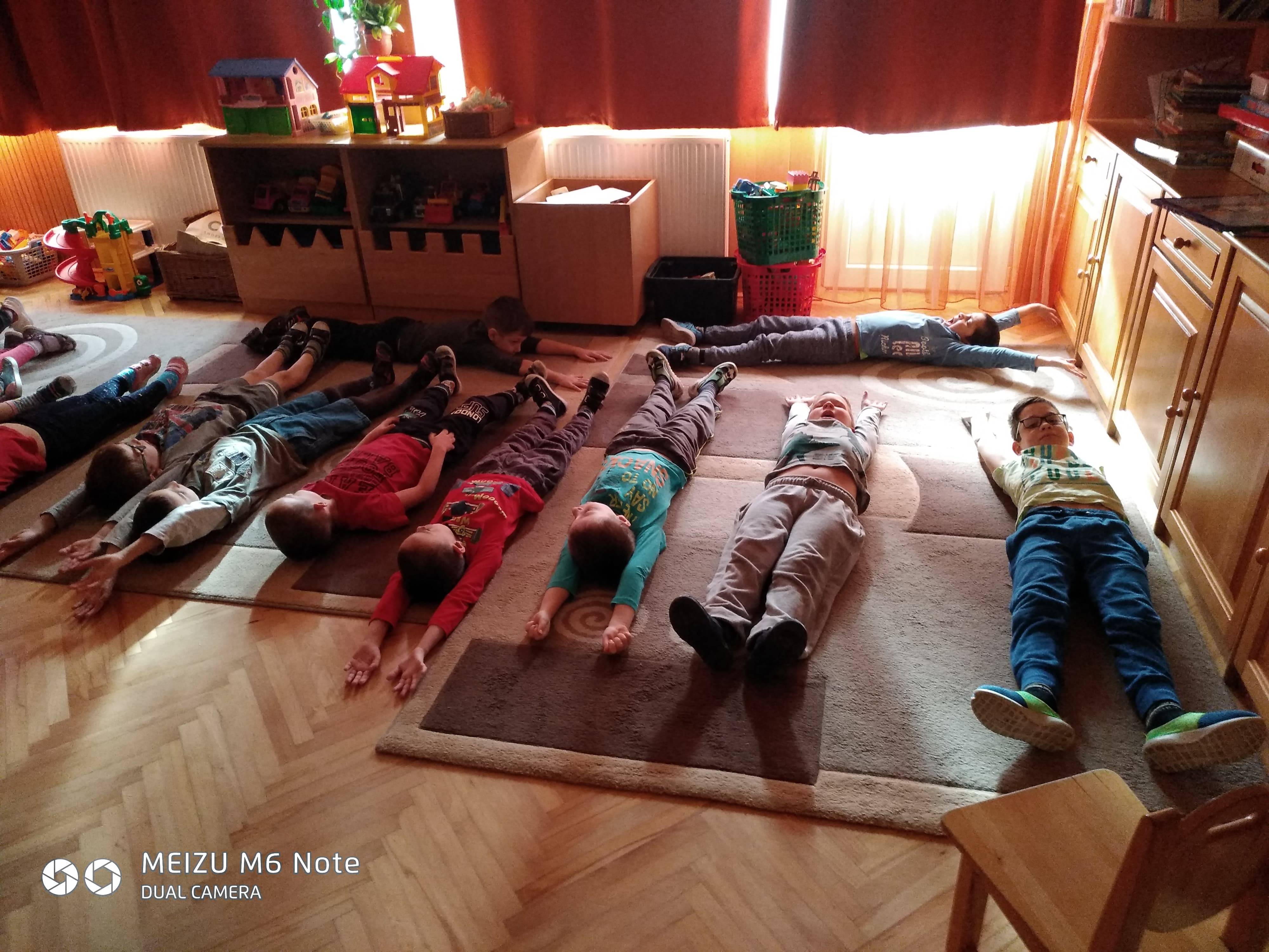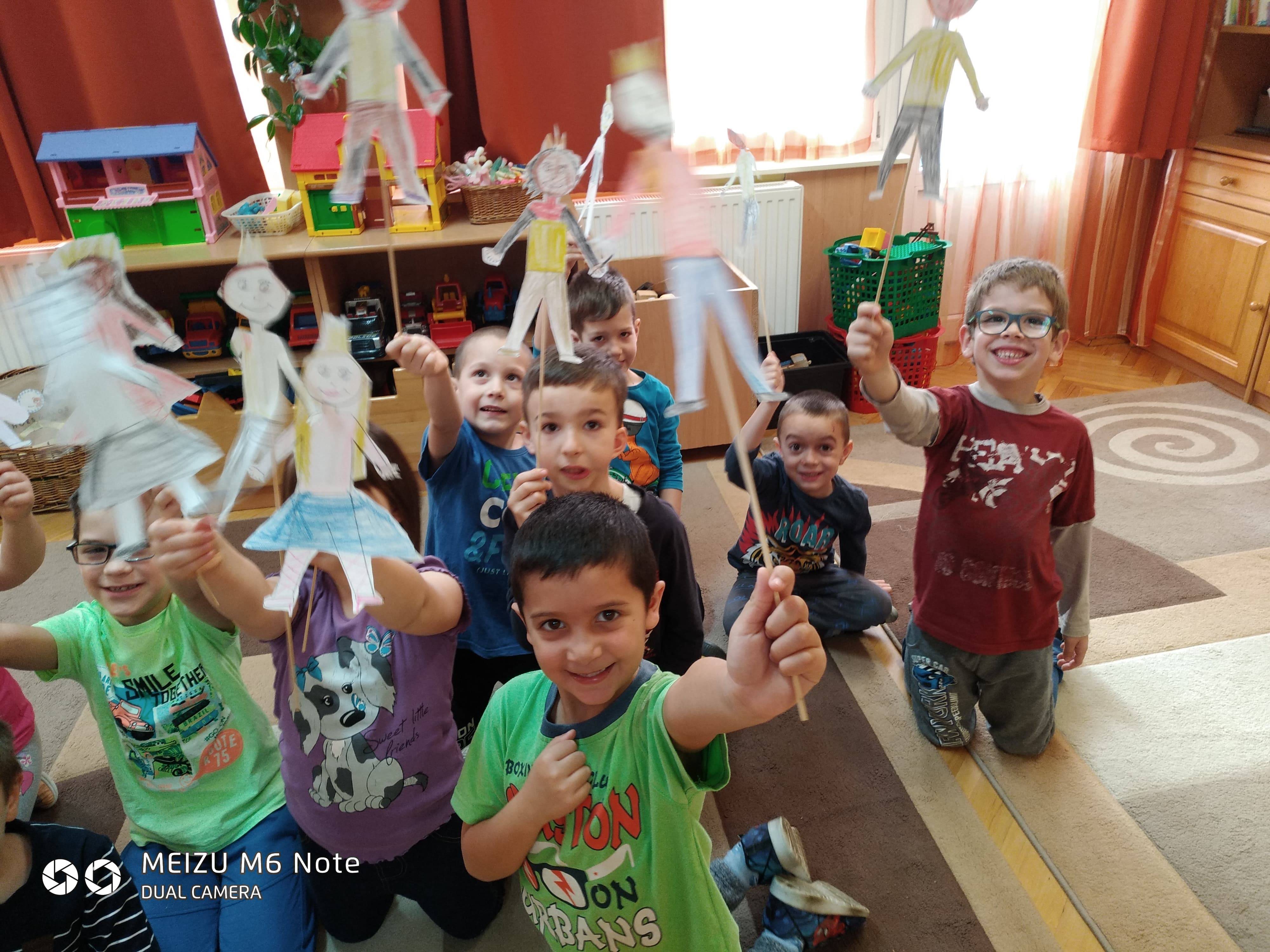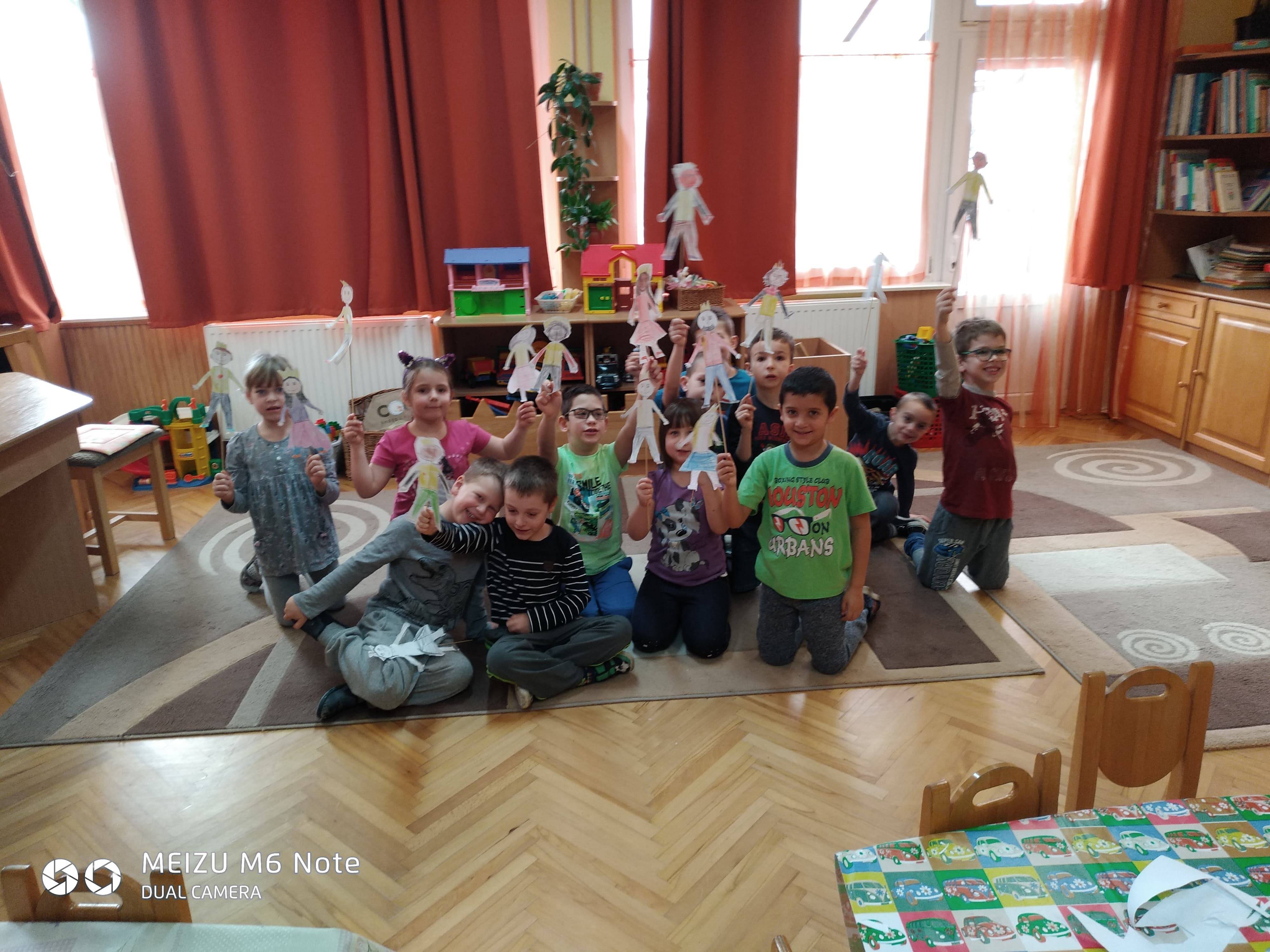 Előkészület: lesötétítettem a csoportszobát és halk zenét kapcsoltam. Lefeküdtem a szőnyegre és a gyerekeket hívtam, hogy csatlakozzanak. Ezután egy vezetett meditációval mentünk el a mesék birodalmába, ahol Az aranykulcs meséjével találkoztunk. A zenét lekapcsoltam és elkezdtem a mesét. Hogy a gyermekek jobban átéljék a mesét interaktívvá tettük. Vándoroltunk….fújtunk, mint a szél….dobbantottunk, mint a sárkány…..találgattuk mi lehetett a legfinomabb reggeli….mié volt az aranykulcs. A mese végén az érzésekről beszélgettünk. Ki mikor érzett szomorúságot, boldogságot? Miután mindenki elmesélte, hogy mikor érzett boldogságot (esemény, ami vele történt), kiosztottam a gyerekeknek az általam előre megrajzolt emberkét. Nemrég a testrészek ill. a héten a betegség-egészség volt a heti témánk, így már beszéltünk róla, hogy nemcsak a bacilusok által kapott betegség betegség, hanem a lelki betegség is az. A négy színt kiválasztottuk az érzelemek színezéséhez és mindenki kiszínezte az emberkéjét aszerint, hogy hol érez a testében jót vagy rosszat. Hol önti el valami különös érzés, ha boldog, ha szeret, ha fél vagy ha szomorú. Ezután az emberkéből királyfit csináltunk, hozzá királylányt és a következő héten, a mesék hetén sárkányt készítettünk. A téma levezetéseként elbáboztuk a mesét. A bábokat senki nem vitte haza, így bármikor szabadon játszhatnak vele a gyerekek.