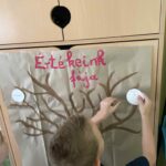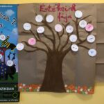 Ezután a nagy munka után Dóra megpihent és én elmeséltem a gyerekeknek Tódi törpe varázsszemüvegét. Dórával együtt beszélgettünk mik is az értékek, hogyan találhatjuk meg magunkban. Előzetesen festettem egy hatalmas őszi fát. Erre a gyerekek kis papír körökre lerajzolták a saját értéküket és felragasztották a fára.