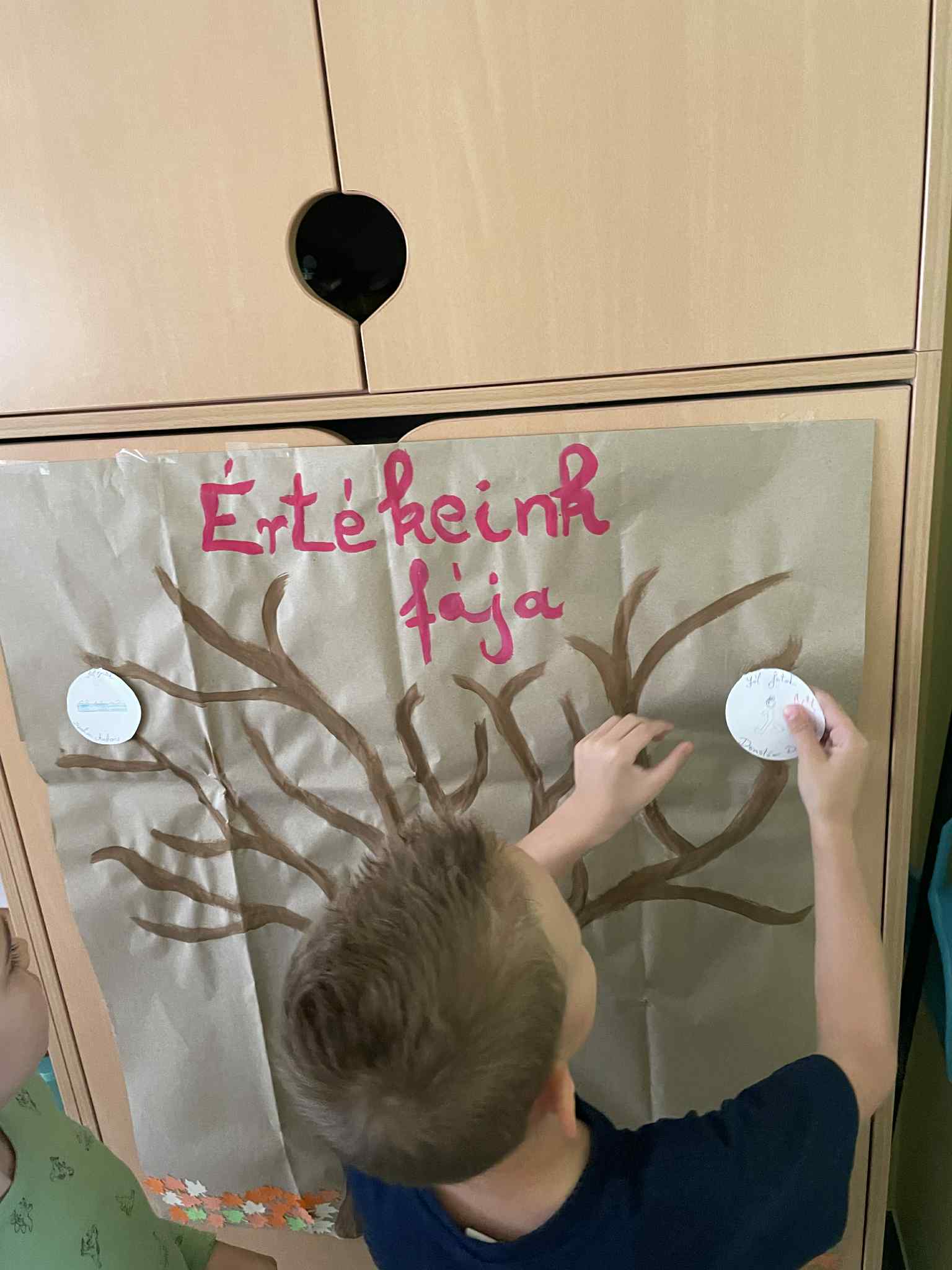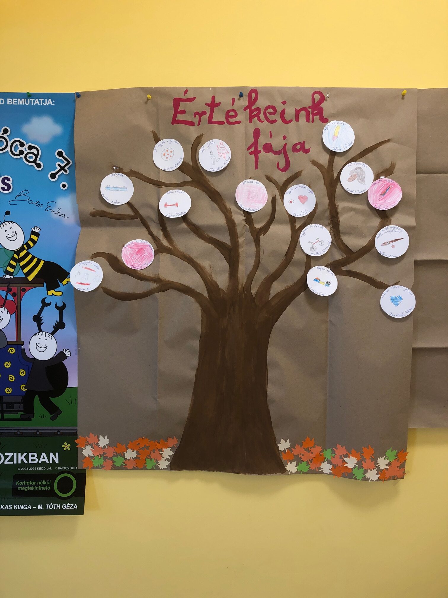 Ezután a nagy munka után Dóra megpihent és én elmeséltem a gyerekeknek Tódi törpe varázsszemüvegét. Dórával együtt beszélgettünk mik is az értékek, hogyan találhatjuk meg magunkban. Előzetesen festettem egy hatalmas őszi fát. Erre a gyerekek kis papír körökre lerajzolták a saját értéküket és felragasztották a fára.