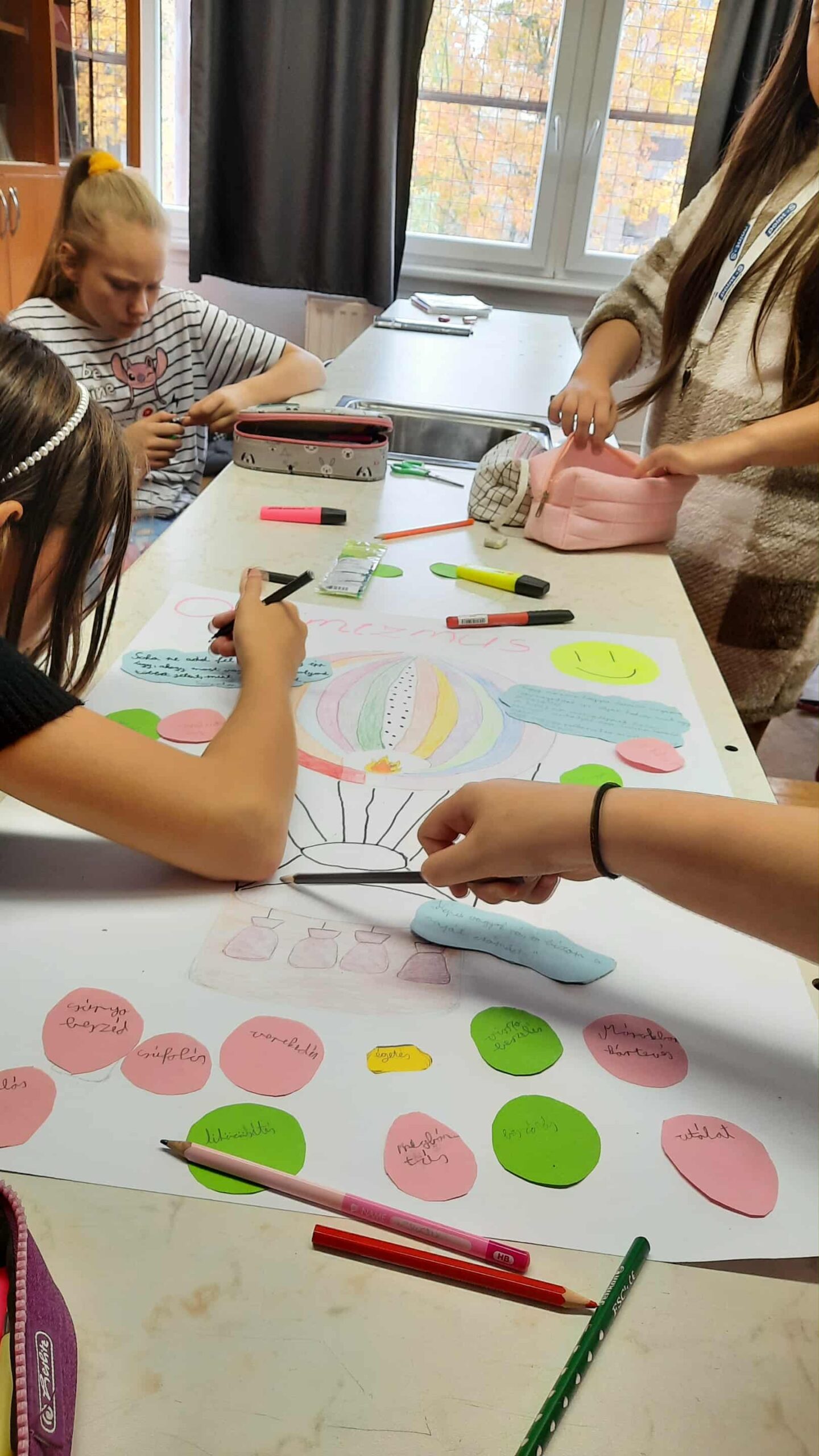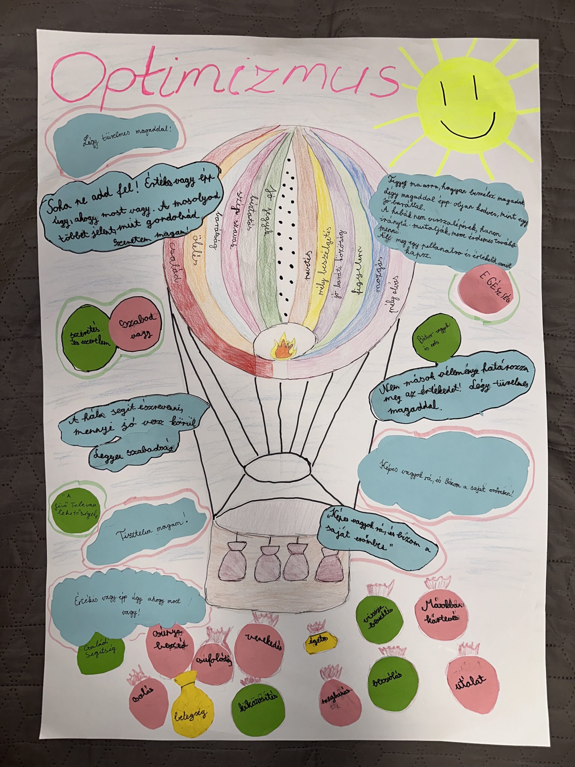 Az optimizmus témakörét a matematika órán tanult pozitív-negatív számok, valamint számok ellentettjeihez kapcsoltam. Beszélgettünk a hétköznapi életben tapasztalt kellemes élményekről, jó dolgokról, pozitív gondolkodásról, amely segít a nehézségek, problémák leküzdésében. A gyerekek közösen elkészítették a hőlégballont, amelyet kiszíneztek és feliratkoztak pozitív kifejezésekkel, illetve köré felhőkben optimista gondolatokat írtak. A mosolygós Napocska is a derűt, vidámságot szimbolizálja. A hőlégballonból pedig jelképesen ledobták a súlyokat, a nehézségeket, a negatív gondolatokat és a rossz érzéseket.