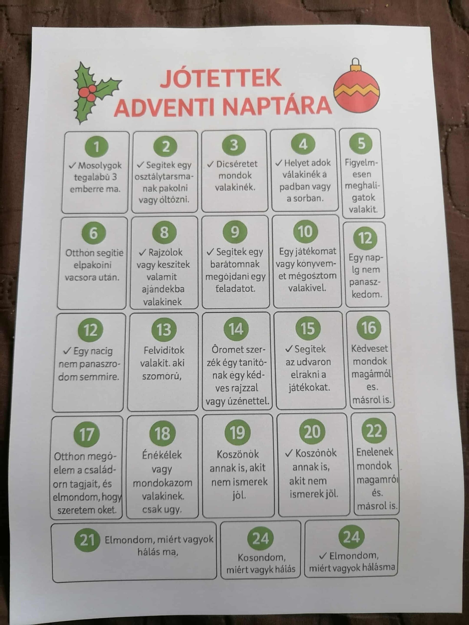 A mese feldolgozása után adventi naptárt készítettünk, amelybe minden napra egy jócselekedet került. A gyerekek saját ötleteikkel gazdagították a naptárt – ezek között szerepelt például, hogy „öleld meg egy családtagodat”, „ajánld fel valakinek a segítségedet”, vagy „készíts valamit mások örömére”. A naptár minden napja lehetőséget adott arra, hogy a jó szándékot tettekre váltsuk, és így fokozatosan formáljuk a mindennapjainkat boldogabbá.