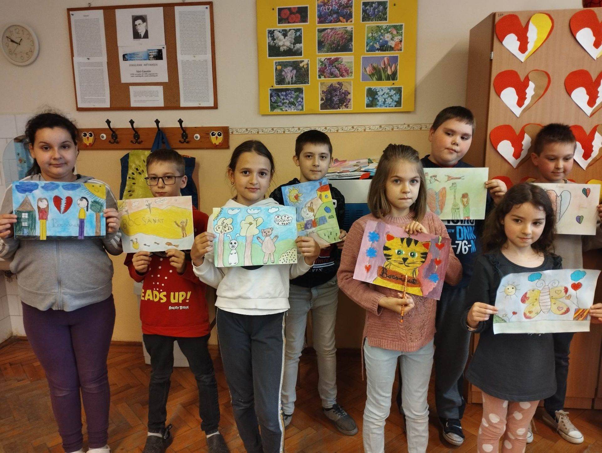 A megvalósítás előtt beszélgettünk a megbocsátásról. Mindenkinek volt története ezzel kapcsolatban. Azt jó volt hallani a gyerekektől, hogy megbocsátani nem könnyű, de annál jobb érzés. Megbocsátás előtt szomorúak vagyunk, az is megbántott és az is, akit megbántottak. Nem jó és nem is kellene egymást bántani. Ezután, mindenki elképzelte, hogy szerinte milyen állat vagy milyen állathoz hasonlíthat a bocsánat. A kész rajzok között volt, aki nem állatként jelenítette meg a bocsánatot, hanem pl.: szív, virágok, eső, felhő, domb, sziget. Az egyik kislány összekötötte a rajz készítését a fenntarthatósági témahéttel, a Földet rajzolta le szívekkel. A Föld jelképez mindent és mindenkit (embereket, állatokat, növényeket), a szívek a megbocsátást.