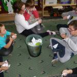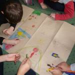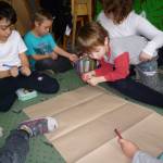 Az órát kellemes meditációval kezdtük, majd mindenki épített tornyot, melyet „gonosz szereplőként” leromboltam. Az ebből keletkezett dühüket közösen dolgoztuk fel (papírt tépkedtünk, kukába dobtuk a feszültségünket, majd közösen építettünk egy új tornyot – a megbocsátás tornyát. A mesét nagy érdeklődéssel hallgatták, majd hősöket rajzoltak óriás papírra -mindenki a maga hősét jelenítette meg.