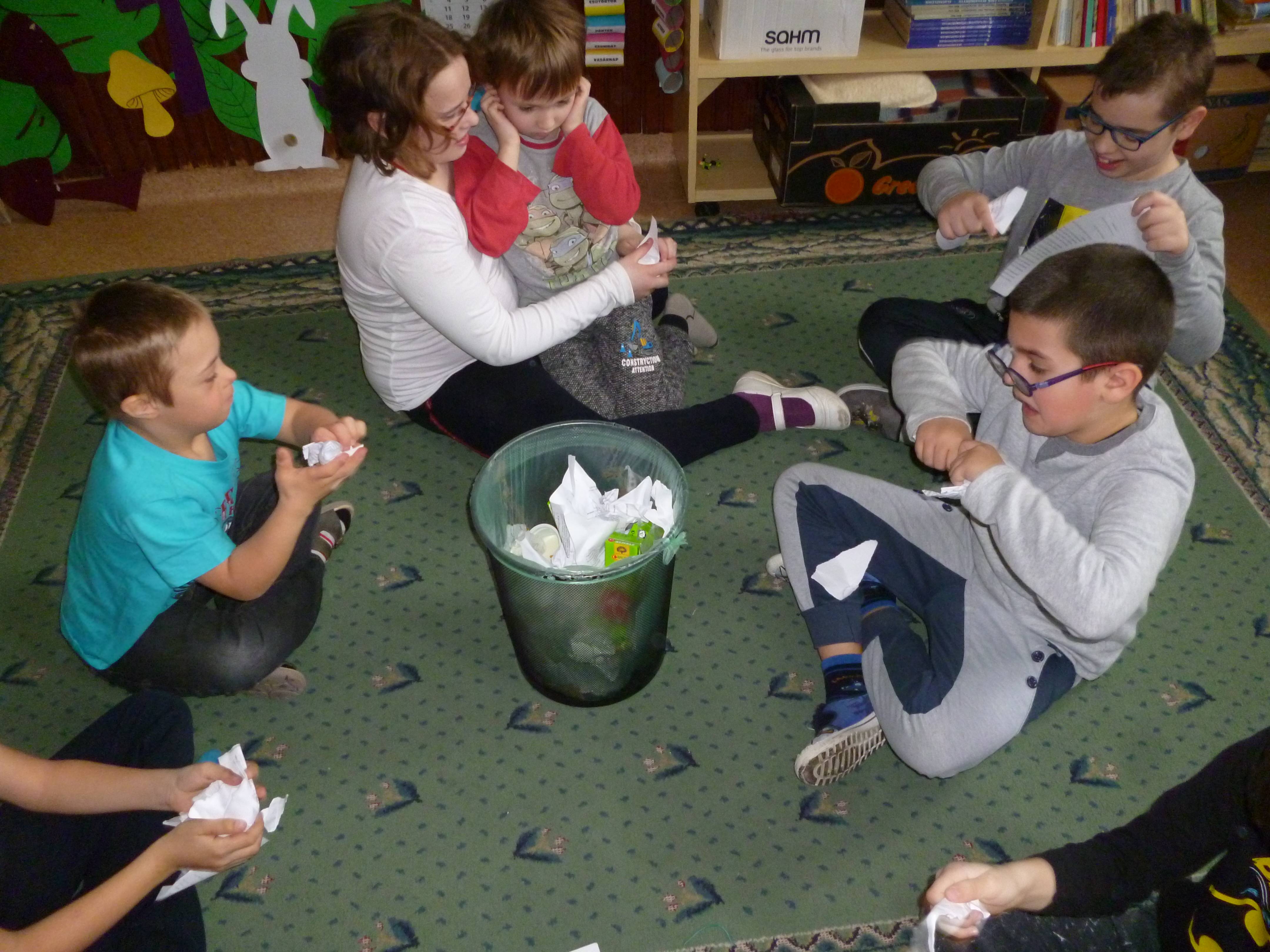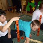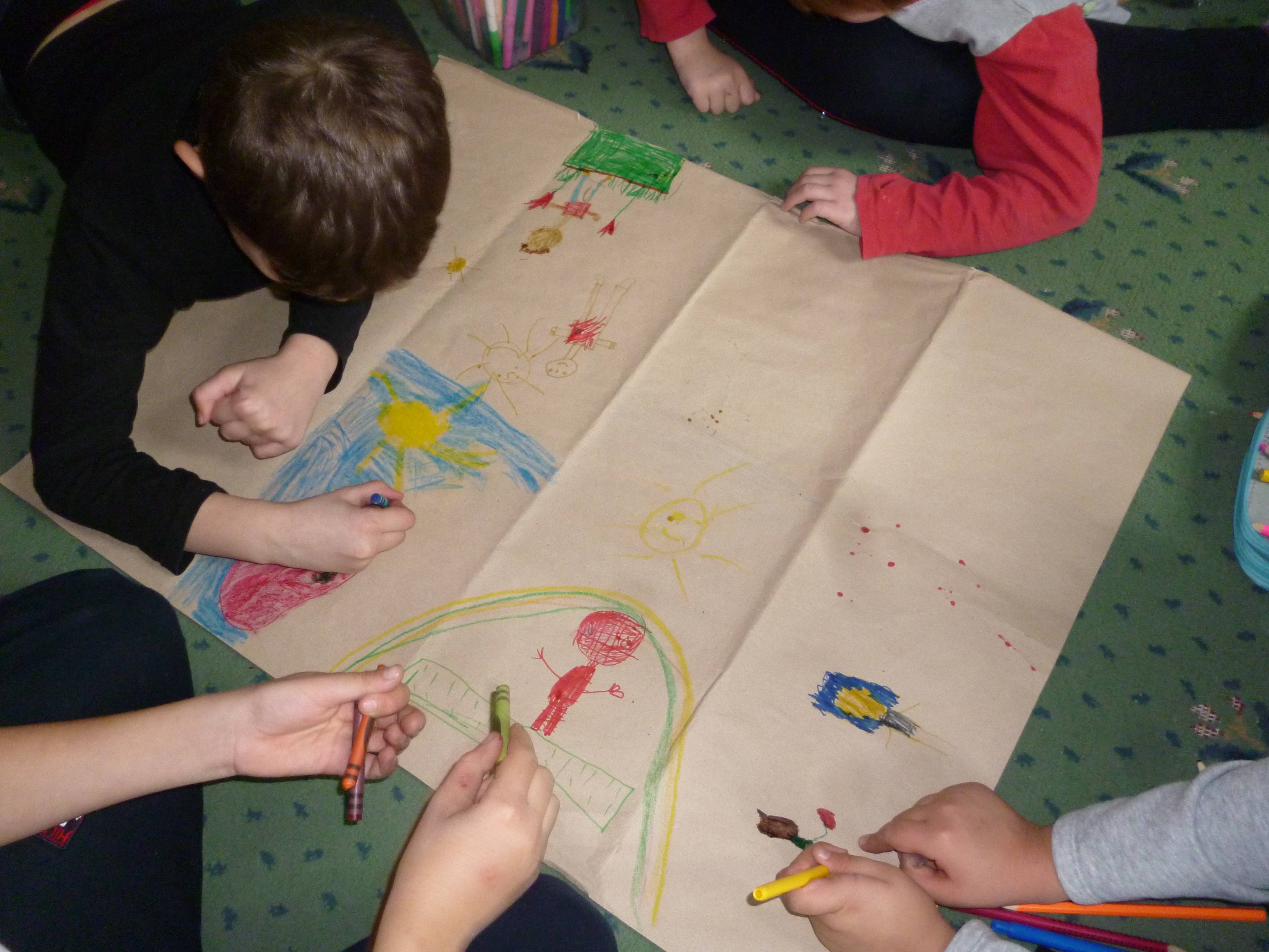 Az órát kellemes meditációval kezdtük, majd mindenki épített tornyot, melyet „gonosz szereplőként” leromboltam. Az ebből keletkezett dühüket közösen dolgoztuk fel (papírt tépkedtünk, kukába dobtuk a feszültségünket, majd közösen építettünk egy új tornyot – a megbocsátás tornyát. A mesét nagy érdeklődéssel hallgatták, majd hősöket rajzoltak óriás papírra -mindenki a maga hősét jelenítette meg.