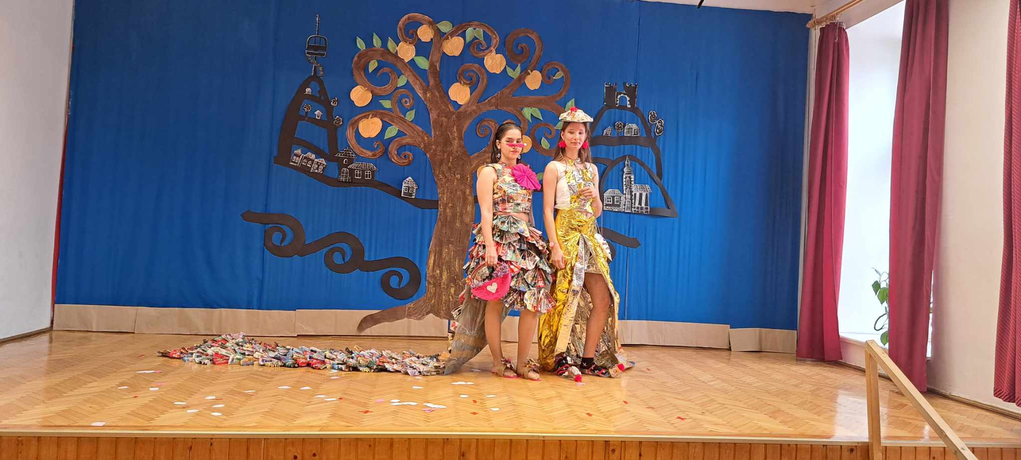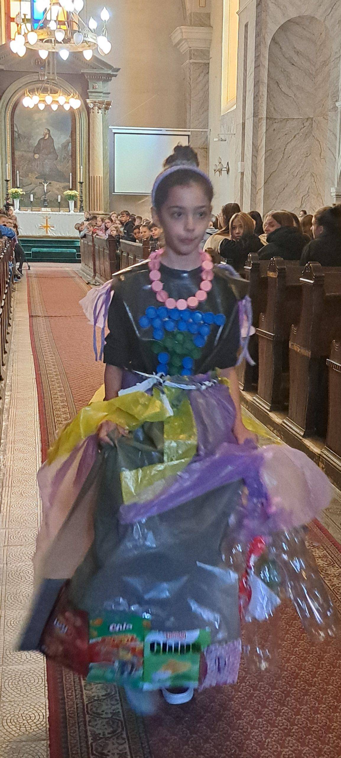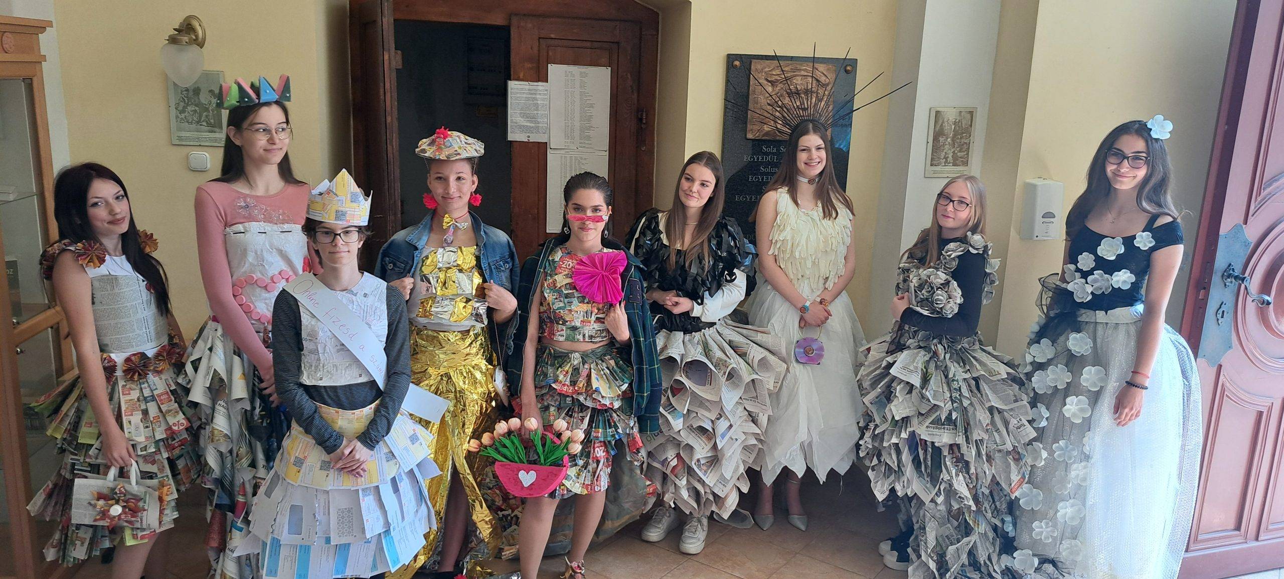 A fenntartható fejlődés ugyancsak fontos iskolánk életében. Ezért a Föld Napjára mindig olyan közös programmal készülünk, ami minden osztályunkat megmozgat. A 2023/24-es tanévben minden osztály az általános iskolától, a középiskoláig hulladékból készített újrahasznosított anyagból készült öltözéket. Az Én osztályom 2 ruhadarabbal is készült a versenyre. A divatbemutatóra a templomban került sor.